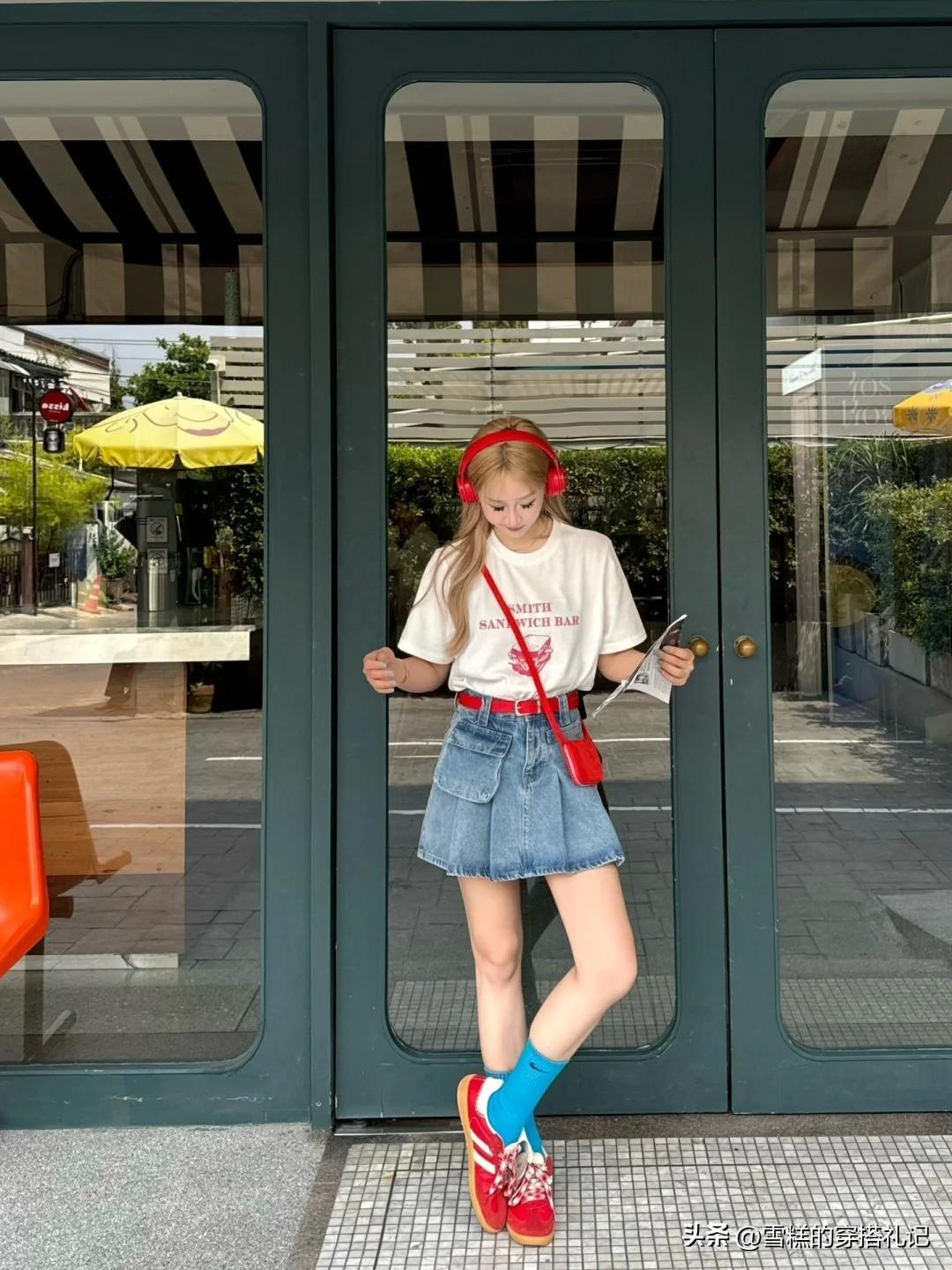 @正紅色+克萊因藍色》》》》克萊因藍色背心裙+紅白撞色運動鞋