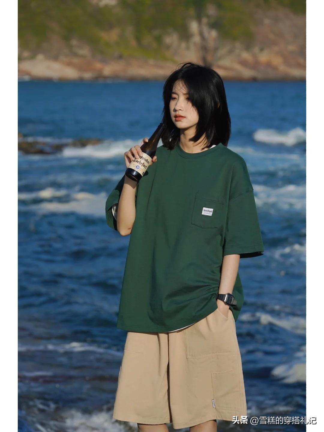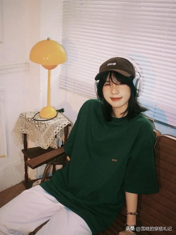 更加休閒一點的墨綠色單品莫過於T恤了,一件寬大的T恤衫作爲日常生活中的常見單品,融入進墨綠色之後,整個人處於一個既文藝又減齡的基調中。