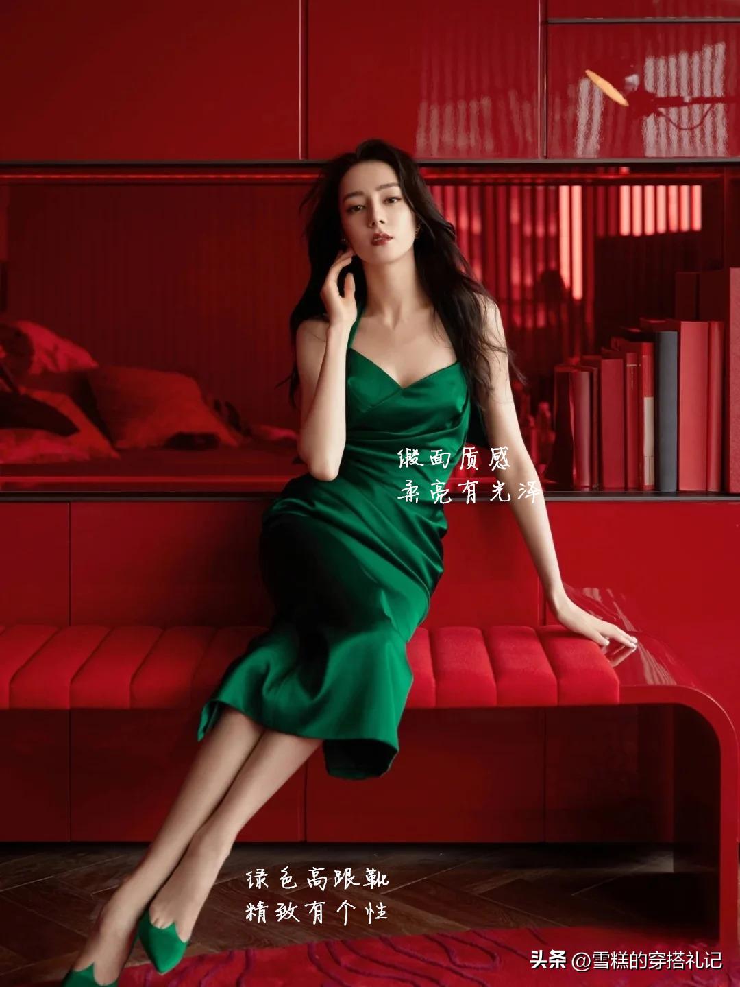 比如像這樣一條墨綠色連衣裙,就可以與同樣是綠色調的高跟鞋進行裙鞋同步,看似佔比很小的鞋子,卻能幫助穿搭變得更加立體同時,也勾勒的整個人更具有貴氣魅力。