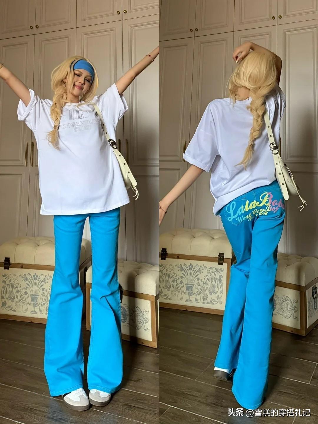 @經典色+克萊因藍色》》》》白色T恤衫+莫蘭迪色微喇褲