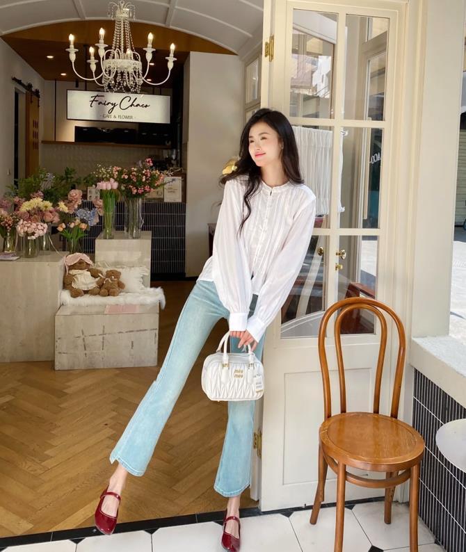 當牛仔褲碰上瑪麗珍單鞋,這兩者便會碰撞出不一樣的火花,這樣的搭配不僅能凸顯出女性的柔美氣質,還能讓你穿出舒適和休閒。無論是逛街約會,還是上班,都能讓你快速成爲焦點。