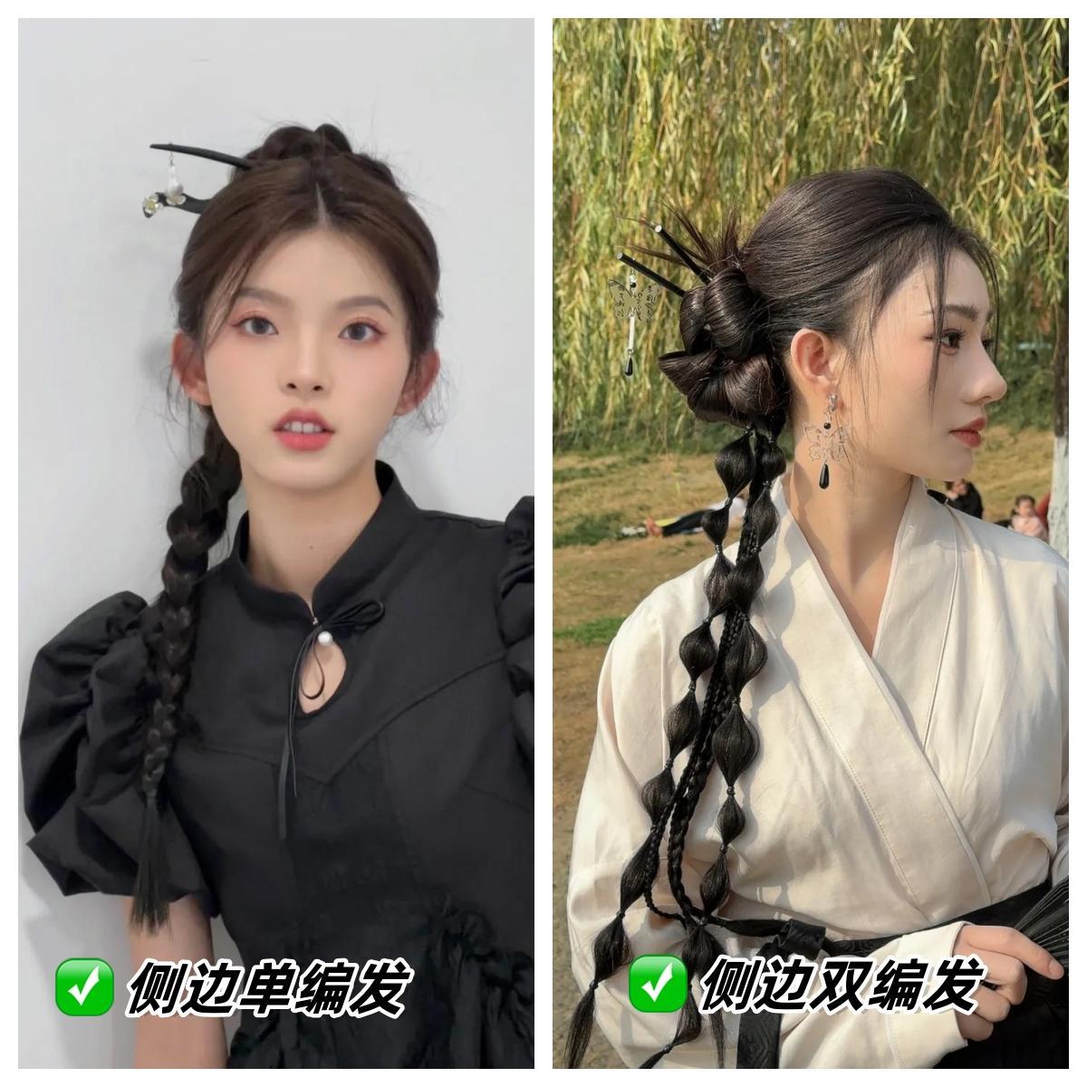 想要挑戰複雜一點的新中式麻花辮,可以藉助假髮或者更多的髮簪搭配,拍寫真或者氛圍感照片都很容易出片,氛圍感很強。