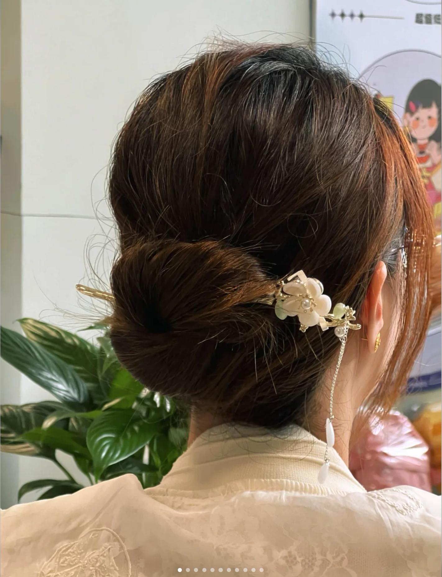 低盤發裏面還有這種花苞頭,將頭髮低低地挽起,露出優雅的頸線,搭配上新中式的服飾,能夠展現出女性的溫婉與端莊。