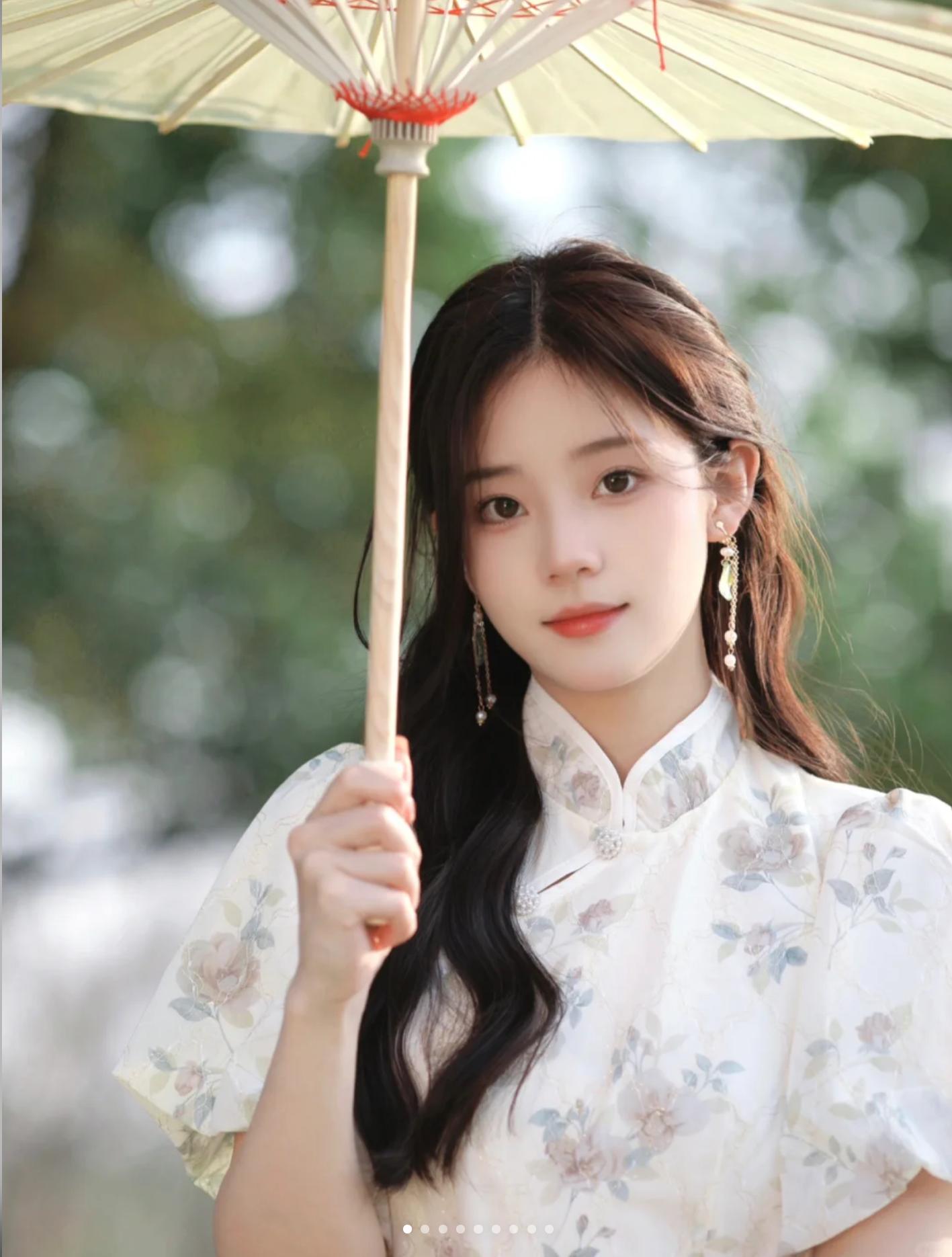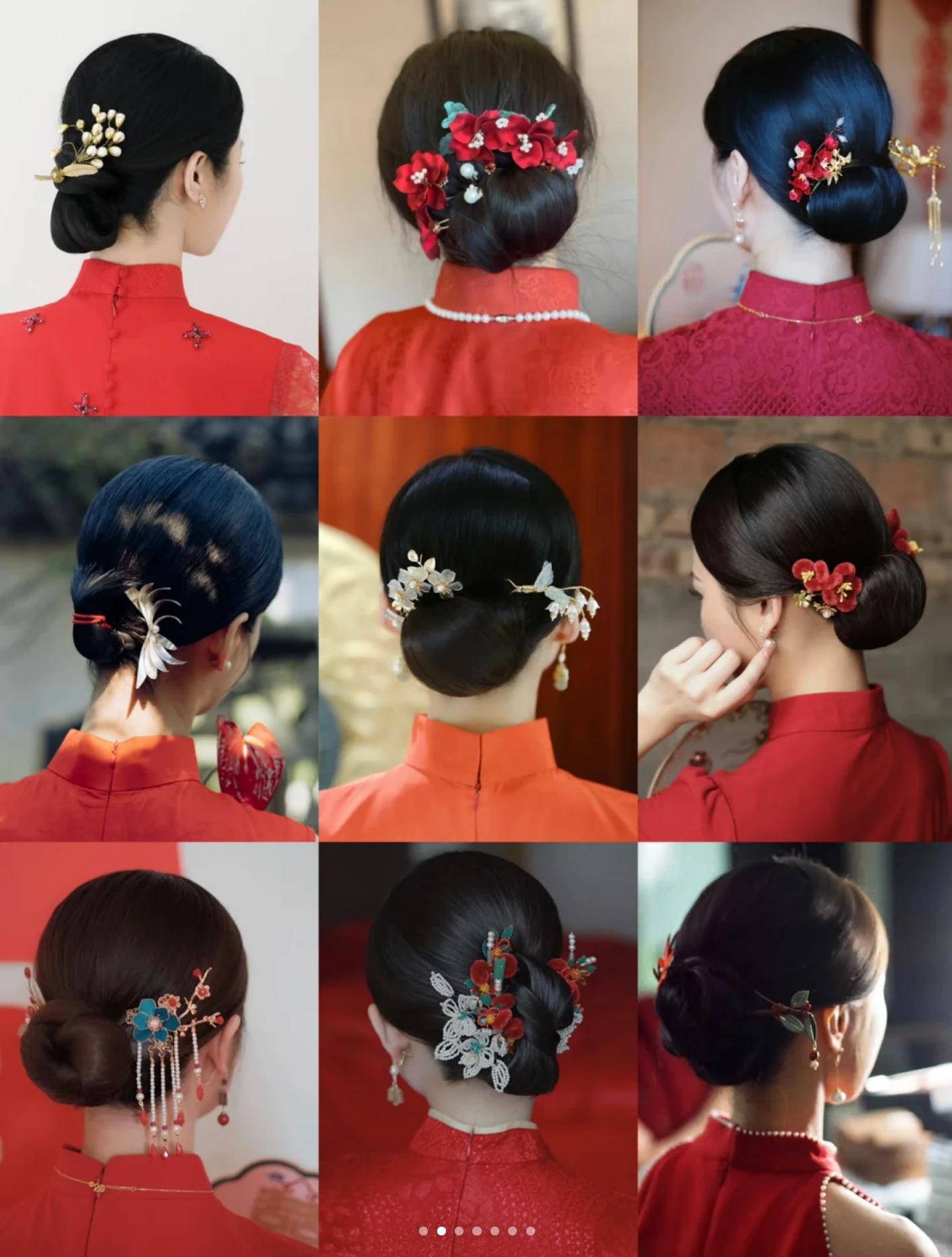 高盤發端莊大氣,與中式旗袍的搭配,詮釋的新中式既有東方美的韻味又如千金般精緻。
