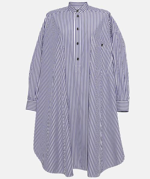 BOTTEGA VENETA(葆蝶家)的這款條紋棉質府綢襯衫式連衣裙具有獨特的風格和魅力。融合了經典的襯衫元素與連衣裙的設計,條紋圖案爲其增添了時尚感和視覺吸引力。棉質府綢的材質通常柔軟、透氣且具有一定的質感,穿着會比較舒適。