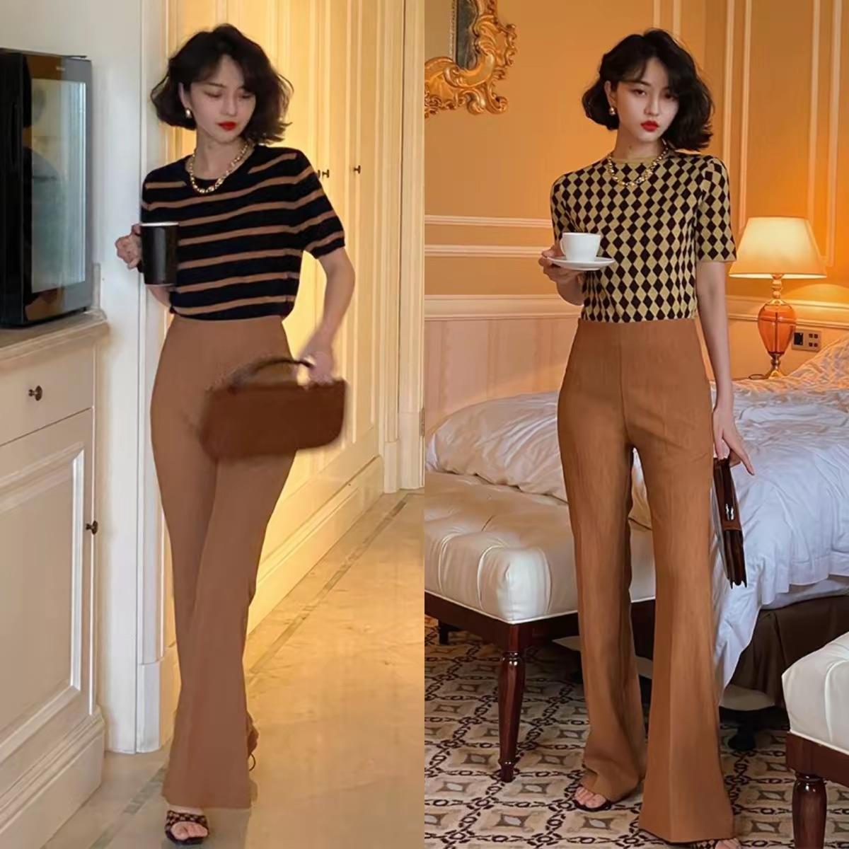 卡其色微喇褲,以簡約的款式、流暢的面料,自然勾勒出大長腿。卡其色微喇褲,配條紋/格紋T恤的時候,也儘量選擇將卡其色融入其中,整體風格協調又高級。