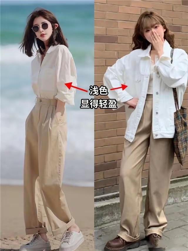 比如白色襯衫、白色吊帶、或者白色T恤,都可以搭配高腰的卡其色褲子來穿着。將白色襯衫/T恤/吊帶的下襬塞進褲腰裏,就輕盈又顯白、顯高效果也不錯。