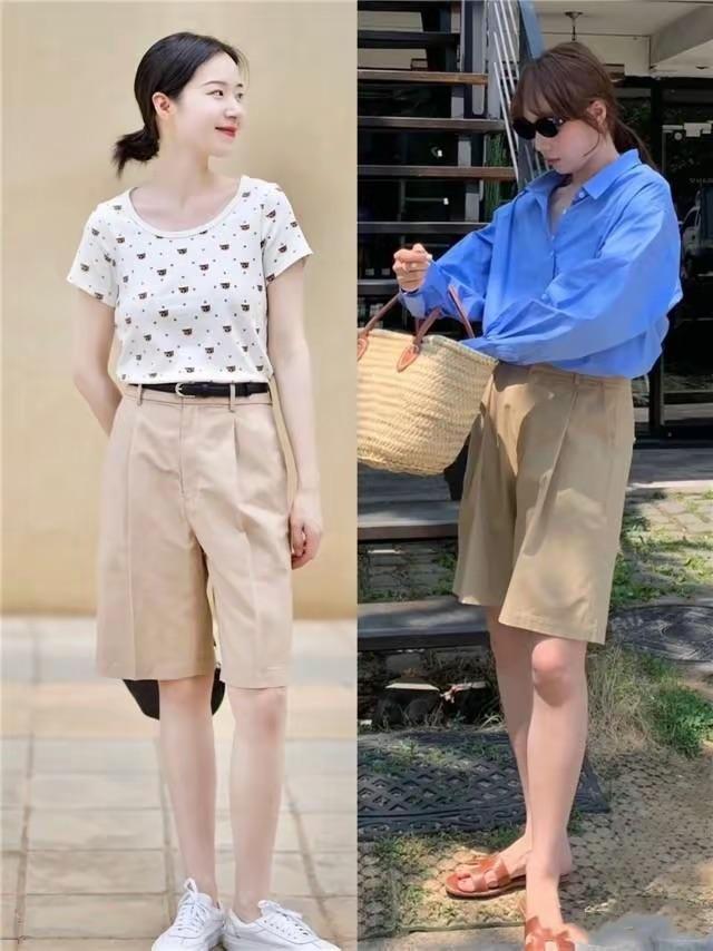 卡其色西裝短褲搭配克萊因藍的襯衫,既時髦醒目、又更加鬆弛大方。寬鬆的卡其色西裝短褲,及膝的長度很是耐看。剛好露出小腿線條、更多了纖薄美。