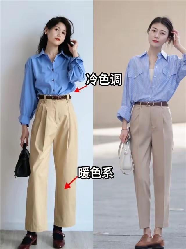卡其色褲子配冷色調上衣、更提氣質顯高級