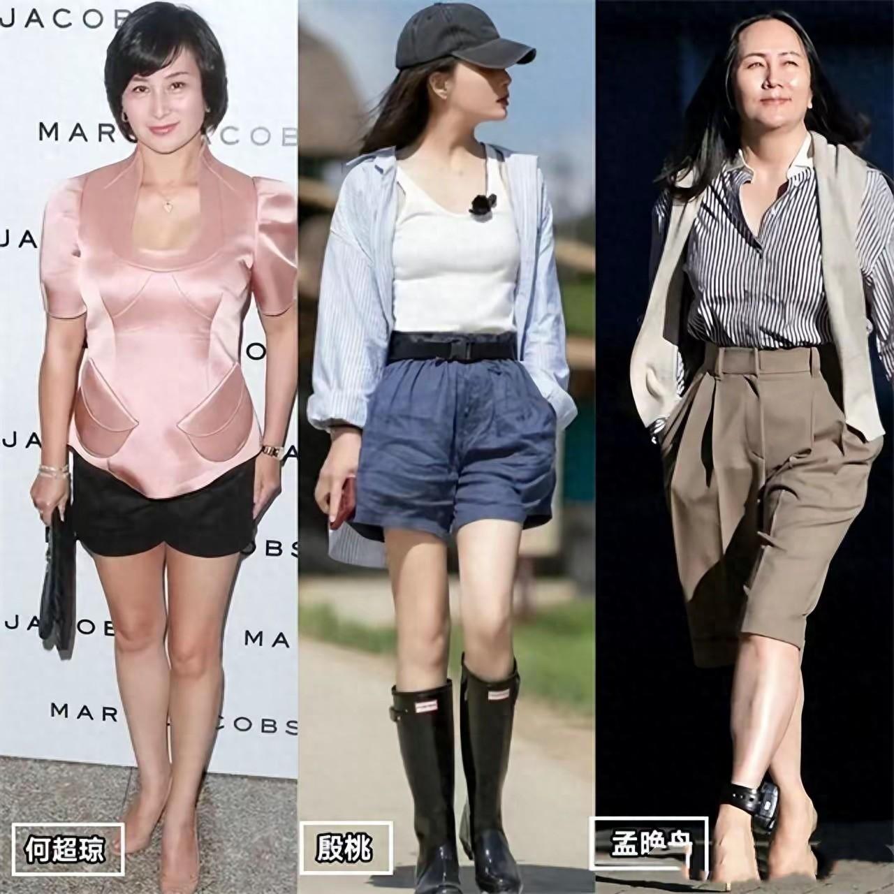 何超瓊、孟晚舟、殷桃,在選擇短褲上,都有自己的穿搭法則。何超瓊穿黑色短褲配粉色宮廷風上衣、超貴氣。殷桃穿吊帶背心配亞麻短褲、休閒隨性。孟晚舟條紋襯衫配西裝短褲幹練優雅。