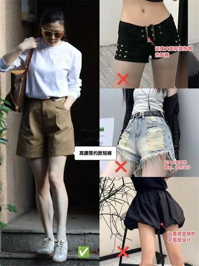 緊身的短褲,雖然能勾勒出曲線美,卻也顯得油膩老氣。我們可以嘗試利落的直線條剪裁的短褲,這種H型的短褲穿起來對於身材修飾性更強、也顯得雙腿筆直挺拔。