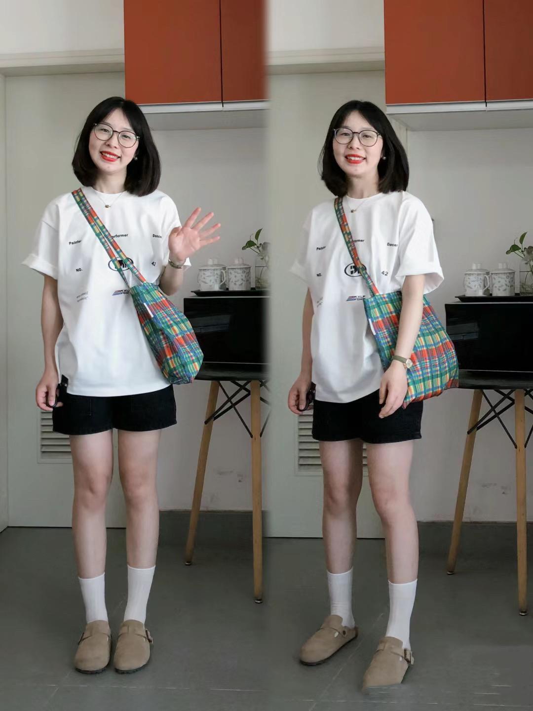 寬鬆一點的白色T恤,點綴了字母印花修飾,簡單又不乏味。搭配高腰的西裝短褲,舒適性更強。西裝短褲的搭配,也可以具備更強包容性,顯得雙腿纖細。