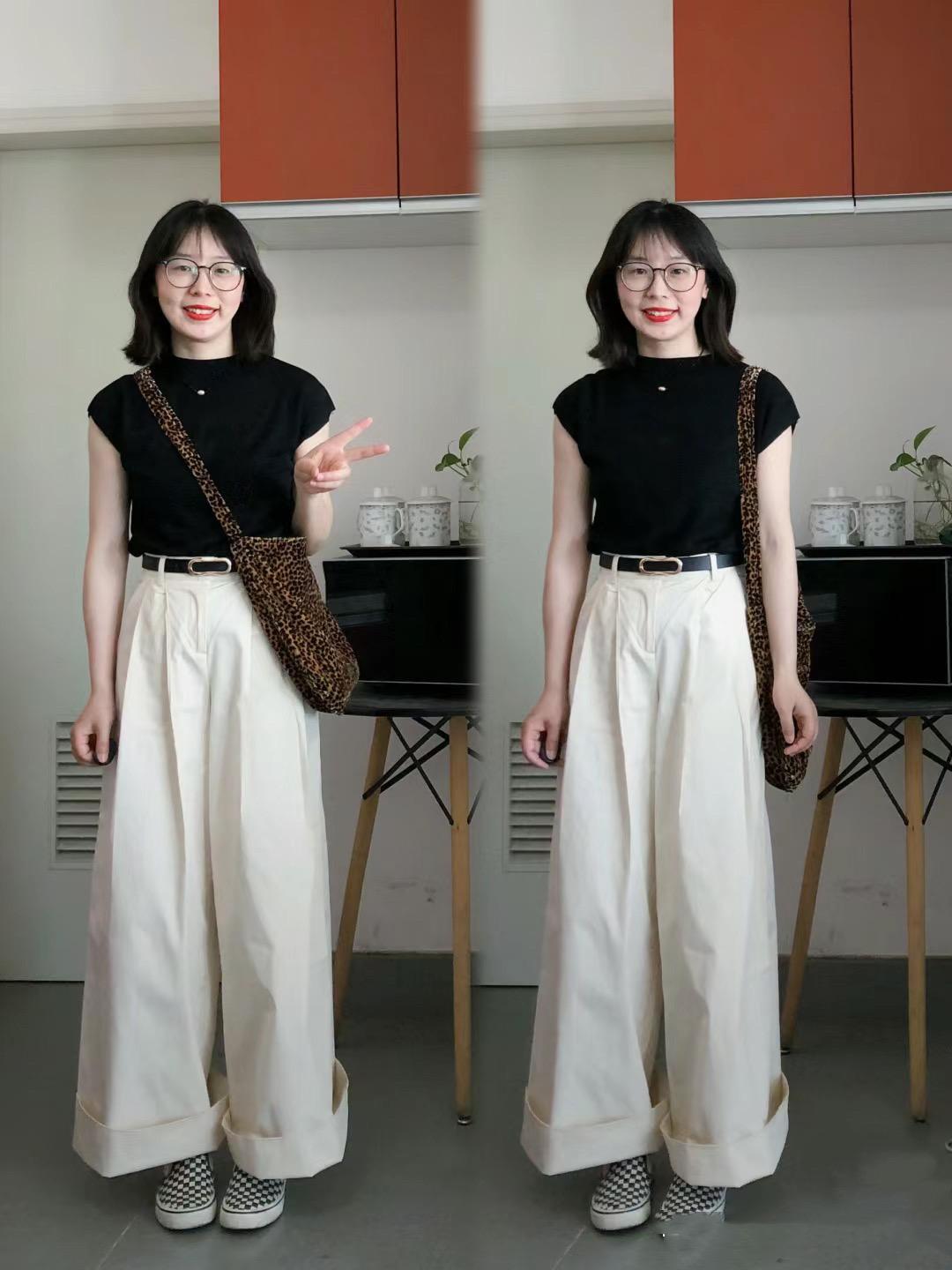 上班通勤的話,自然需要更加利落大方一點。小飛袖的黑色T恤,配經典的白色闊腿褲,黑白配高級又耐看。