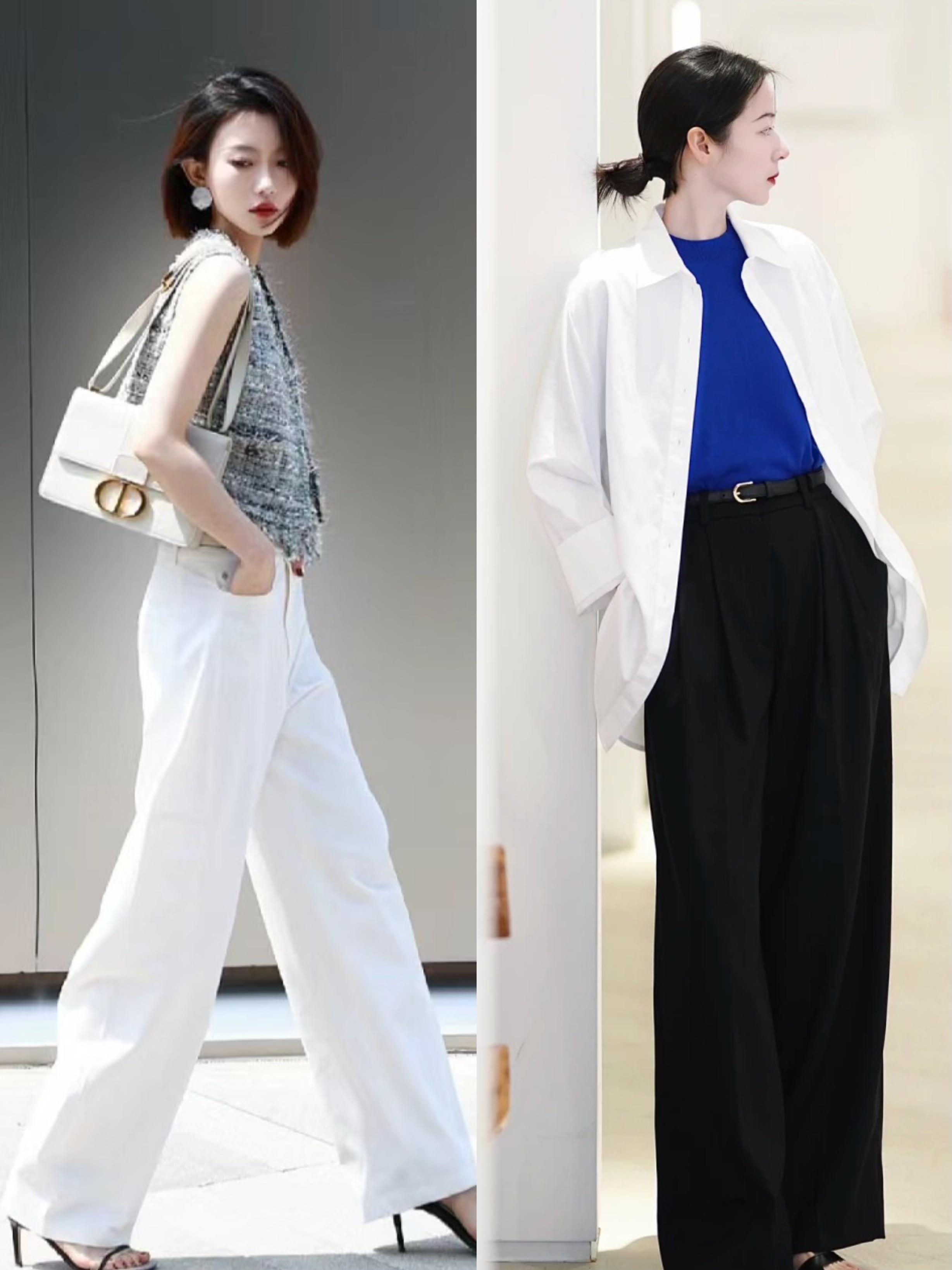 寬鬆的白色襯衫,搭配高腰的黑色西裝褲,以藍色T恤作爲內搭,非常的高級且醒目。黑色西裝褲抬高了腰線,瞬間就擁有一種大長腿的效果。