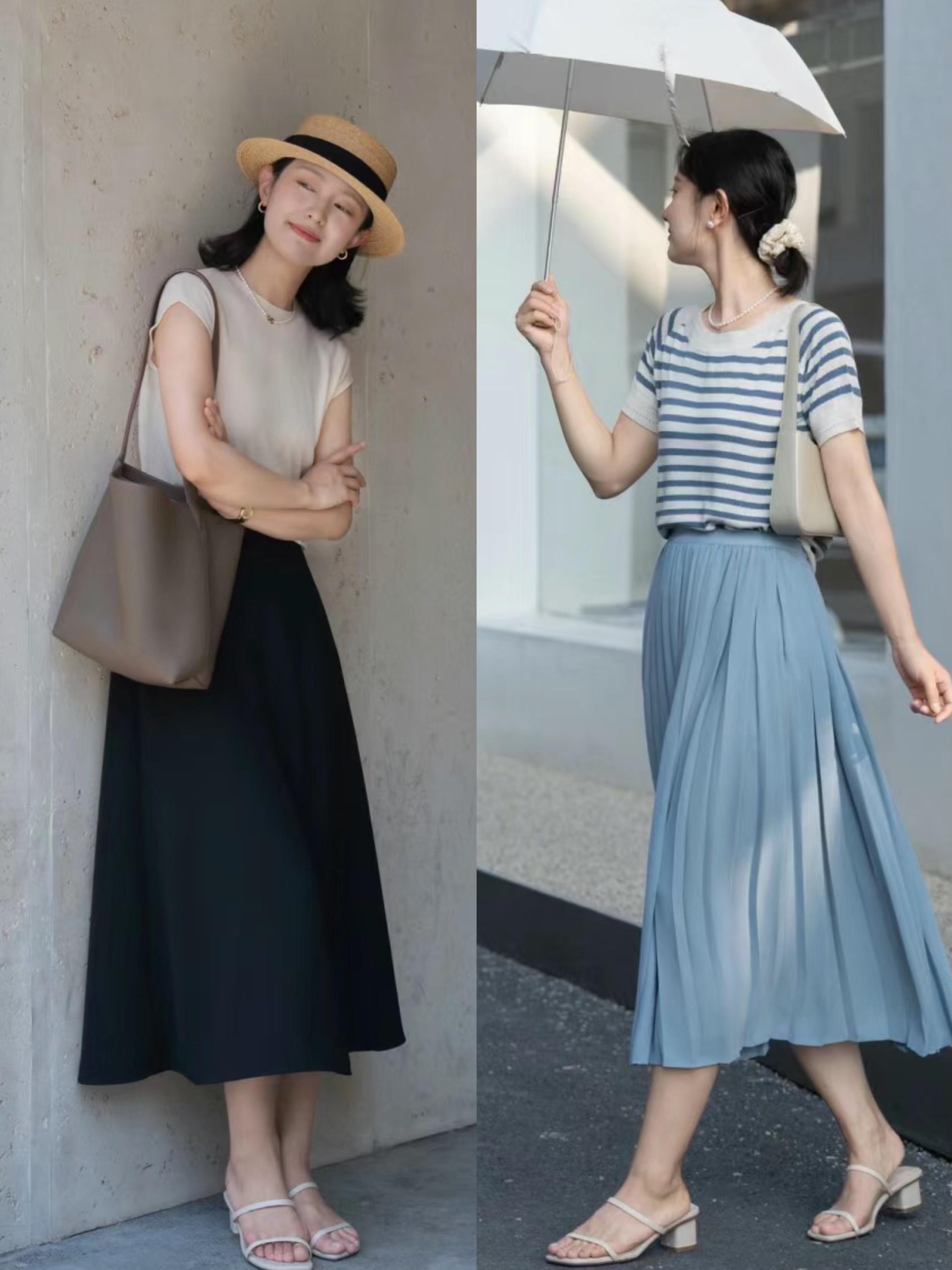 簡約系的穿搭,並不是忽視細節,而是讓我們更精心的搭配每一個細節元素。條紋的T恤,配同色系半身裙,有一種溫潤嫺靜的美。