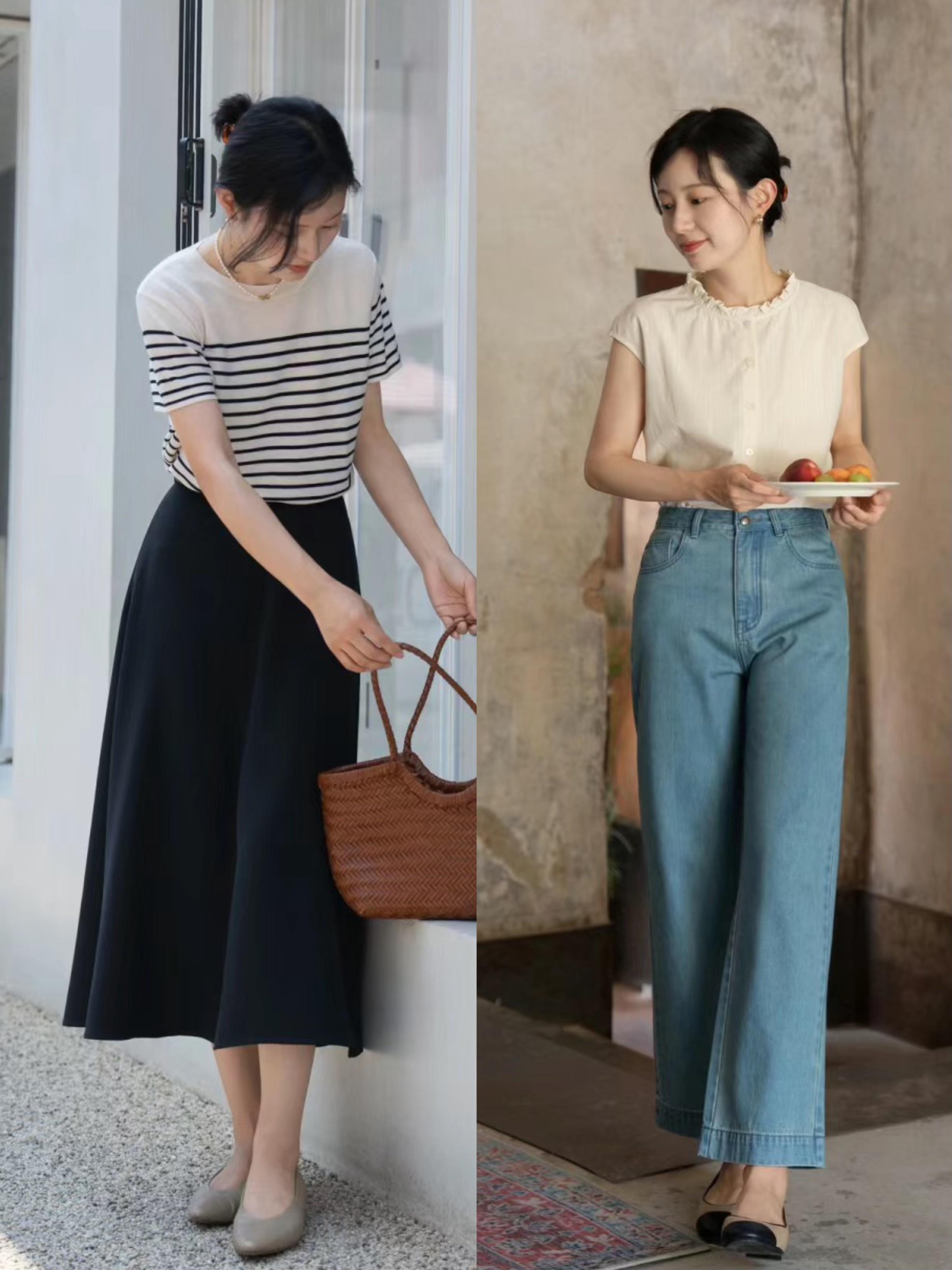 比如條紋的T恤、或者小飛袖的襯衫,不那麼單調、又帶着自己的風格屬性。不管是配裙裝、還是褲裝,都非常的雅緻大氣。