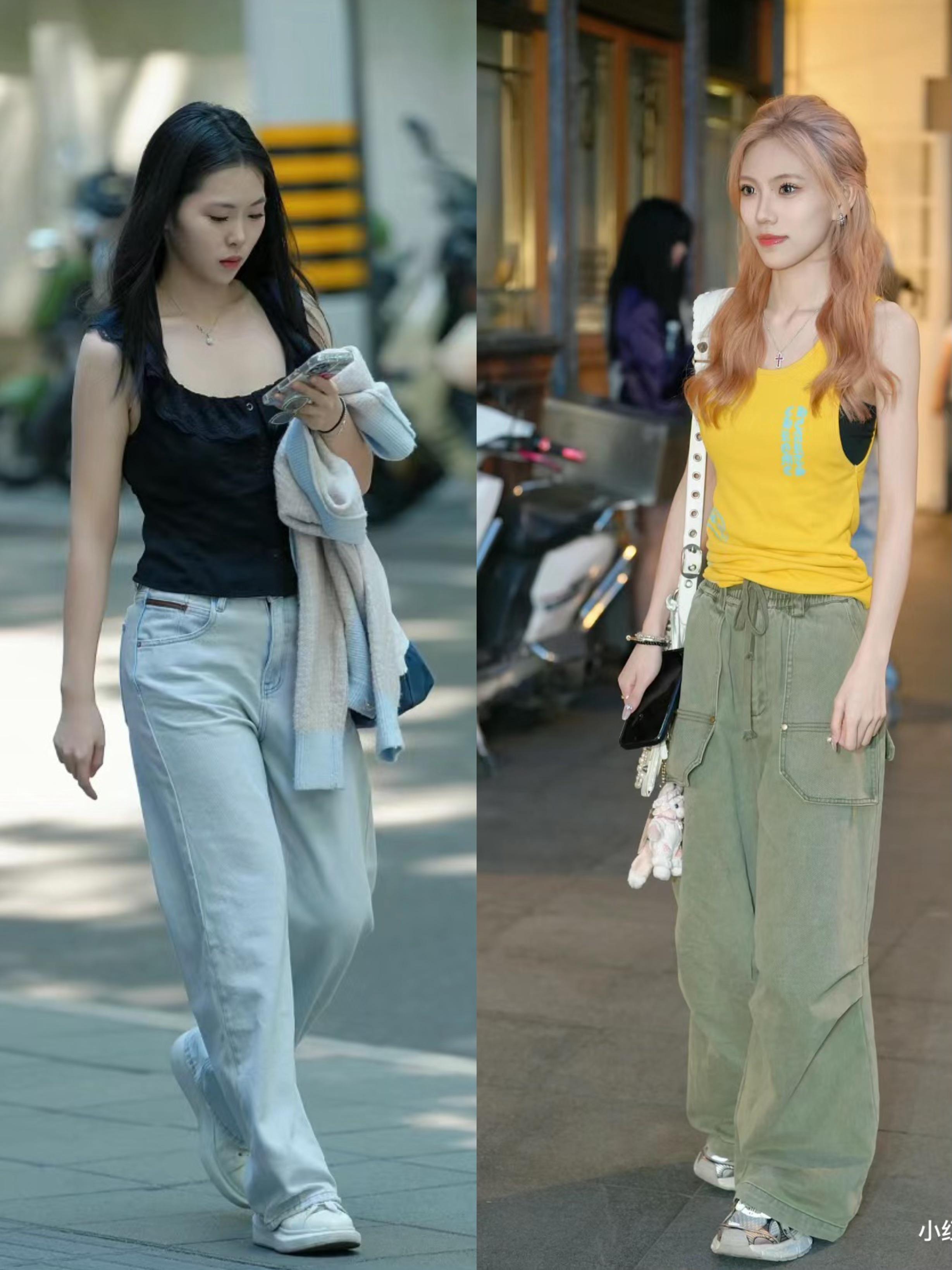 一組對於身材包容性更強的穿搭,如果你也喜歡隨性舒適的風格,可以嘗試小背心+闊腿褲的穿搭look。