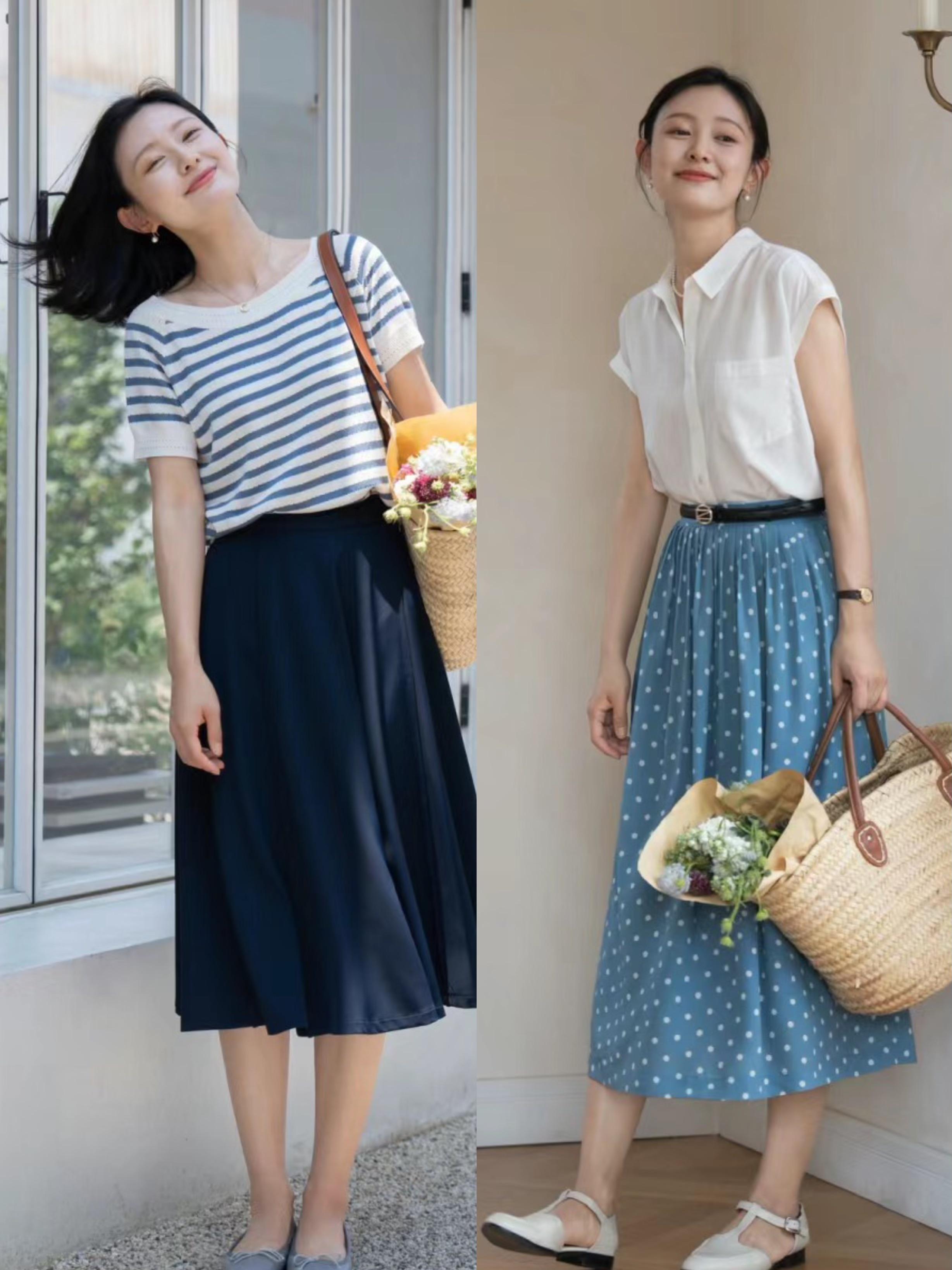 比如文藝風的藏藍色半身裙、或者法式波點印花半身裙,穿上身就自帶浪漫減齡的氛圍。這種簡約系穿搭、也格外的 清爽洋氣、瞬間年輕了好幾歲。