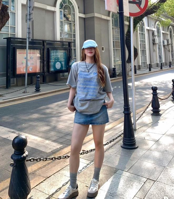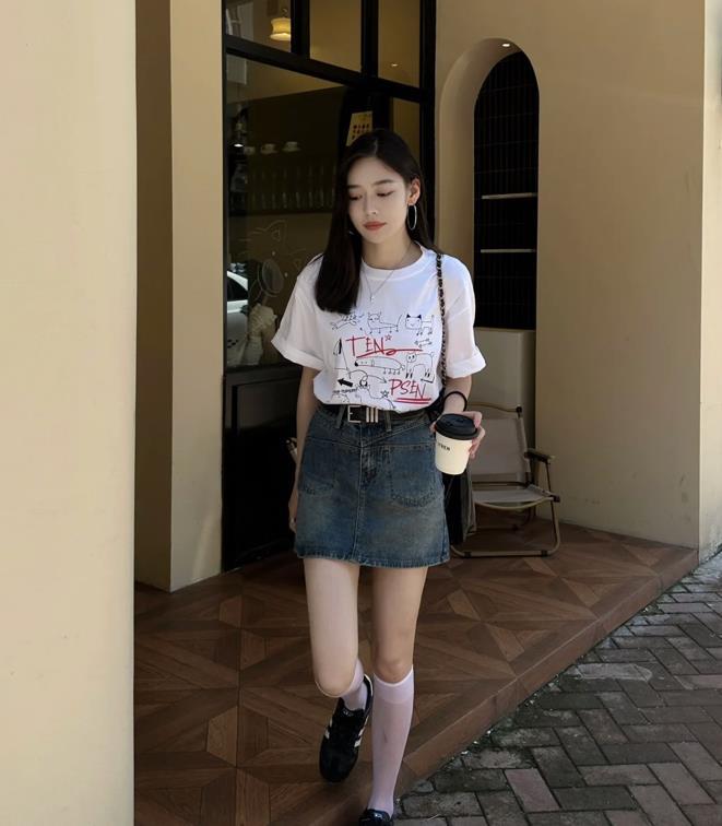 t恤作爲一年四季都不會過時的上衣,它的百搭性是毋庸置疑的,在日常穿搭裏t恤的利用率也非常高,當然,最重要的是它可以讓你穿得舒適自在。不同款式的t恤,所展現出來的效果也是不一樣的,搭配牛仔半裙,時尚又好看。