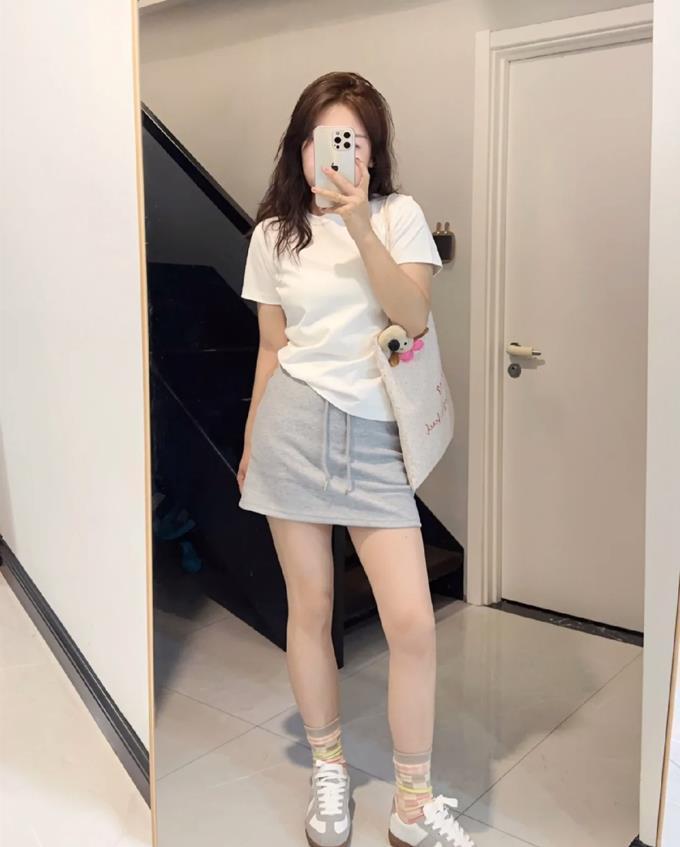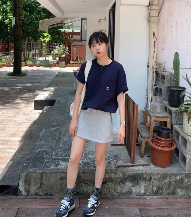 藏藍色的短袖t恤,覺得穿黑色會顯沉悶壓抑的話,姐妹們夏天就去穿這個顏色,很顯沉穩又百搭,與灰色運動半身短裙搭配,再加上一雙運動鞋後,休閒又舒適。