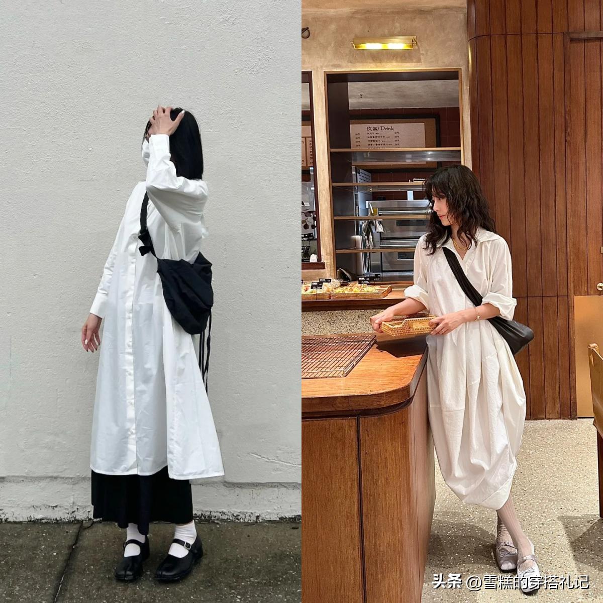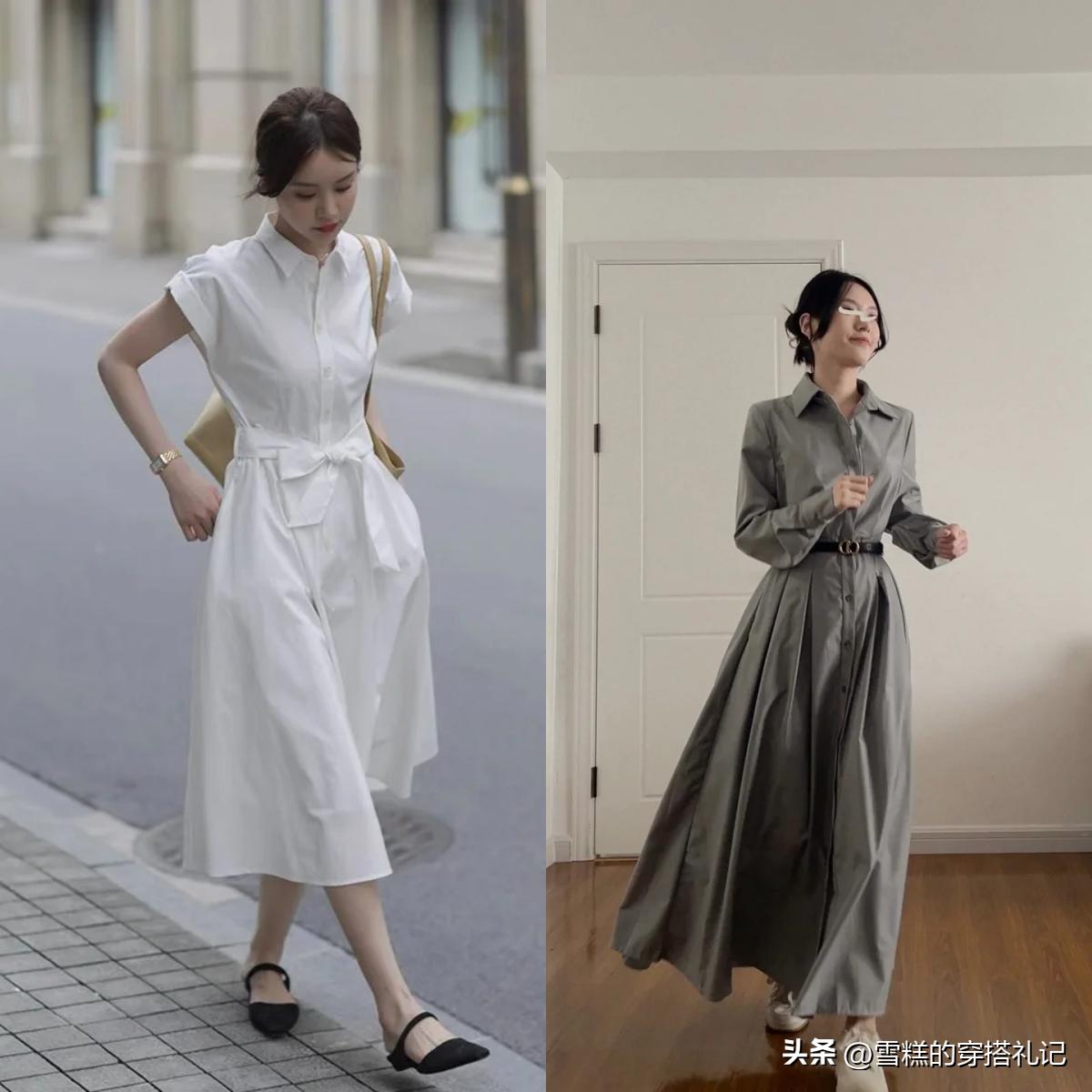 襯衫連衣裙絕對是通勤的一把好手,因爲一面光的白色不需要我們再去考慮其他的設計要素,也不用擔心單品之間的銜接問題,純白的通勤和休閒氣質很明顯,可以選用單層的面料來展示出服帖的版型特點。