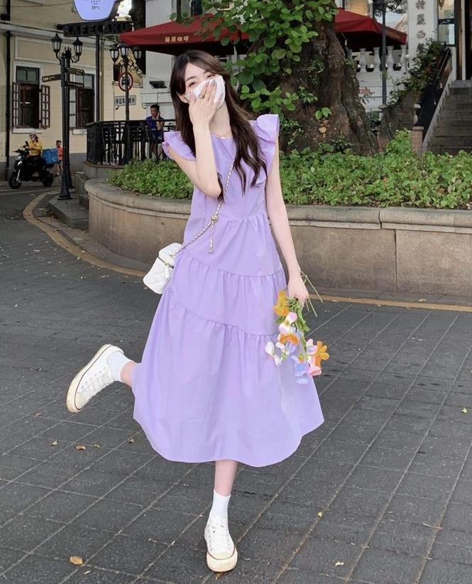 紫色真的好好看啊,這麼一條小飛袖裙子,看起來也太仙氣了吧,有些寬鬆的裙身,給足了身材遮掩,顯瘦不說,還讓你感受到輕鬆和自在。出門搭配一雙帆布鞋,紫色和白色的搭配,就是好看。