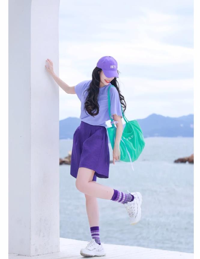 誰說同色系的搭配看起來會顯得很沉悶單調呢?完全就沒有好嗎,不同深淺的紫色搭配,看起來就非常顯層次,淺紫色t恤+深紫色休閒短褲,利用一雙紫色襪子進行外露出來,輕鬆就打造出層次感。