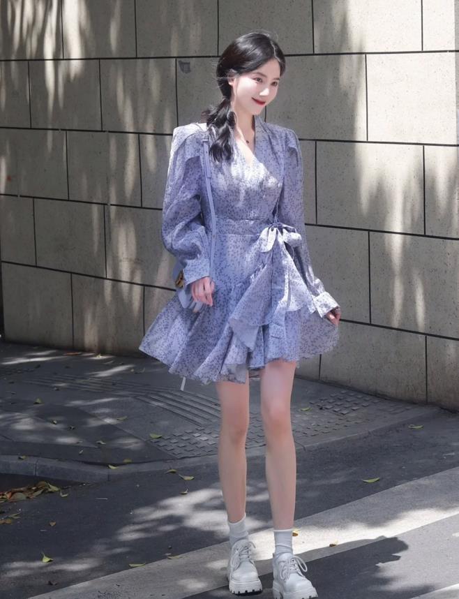 穿上這條紫色的裙子,感覺整個人都在發光,是一種很清冷的紫色,看着就非常溫柔,V領+裹身的設計,不僅僅是修飾了身材,更多的是拉長脖子線條,襯托出小臉蛋。低飽和度的配色,把膚色襯托得很白皙。