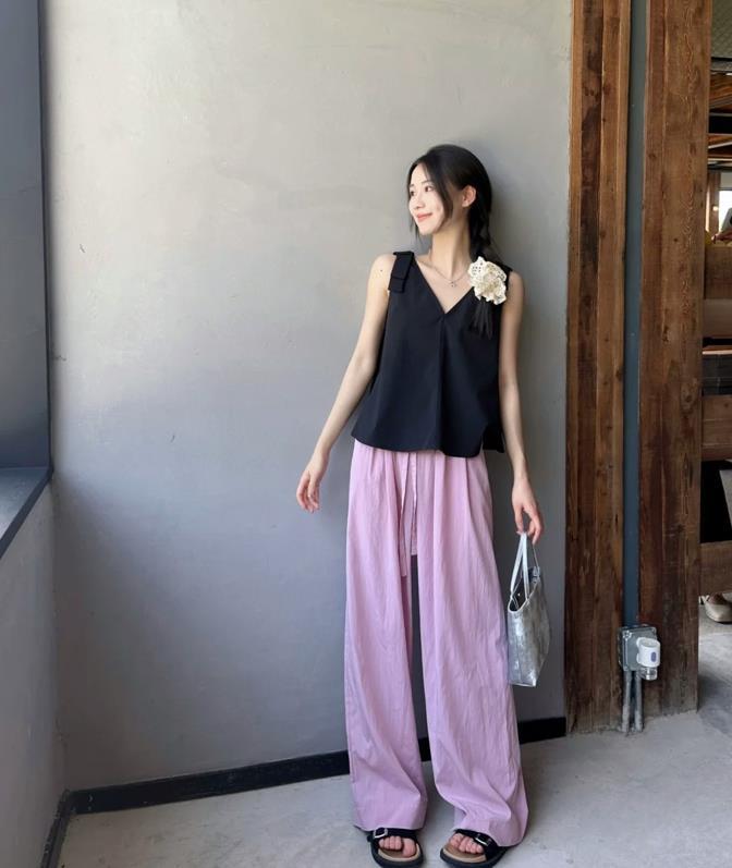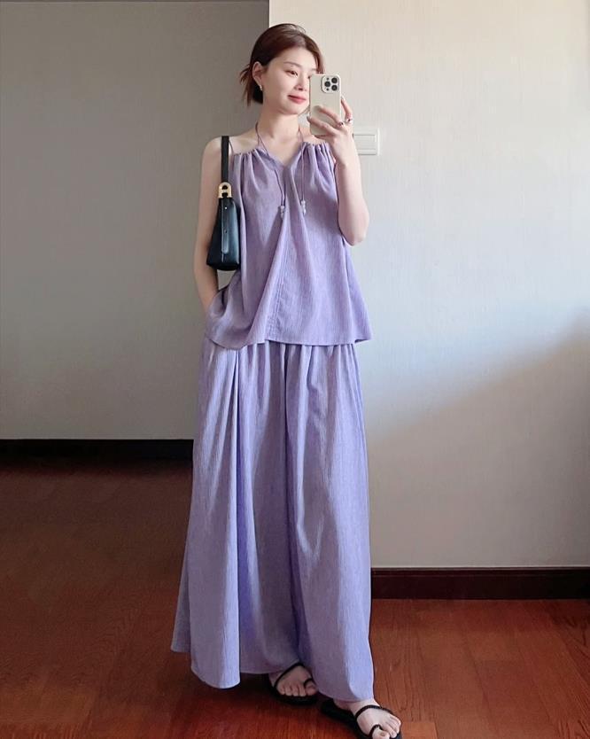 紫色系的闊腿褲套裝,這對於懶人來說,那簡直是太合適了,吊帶+闊腿褲,加上輕薄透氣的面料,很舒適又涼快。上下版型都是寬鬆的,給你展現出隨性和自在。