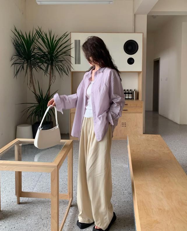 隨性與溫柔並存的一件紫色襯衫,看到它的第一眼就非常心動了,選擇內搭一件白色打底,加上一件卡其色山本褲,那種隨意鬆弛的感覺就出現了,很清涼透氣和舒適。