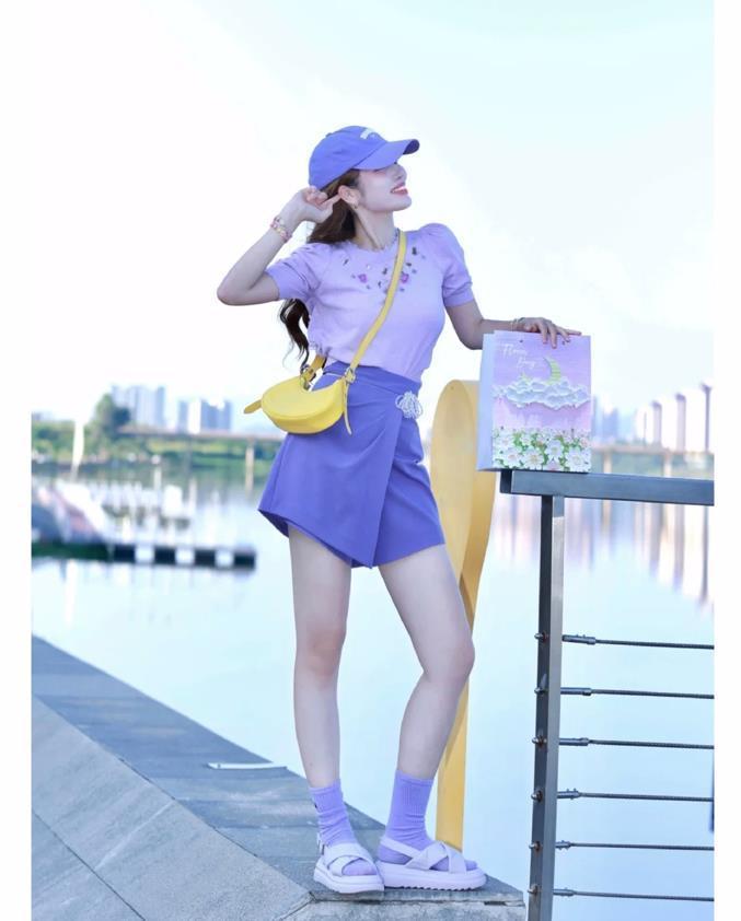 夏天的穿搭,還得要穿得活力洋氣一些呢,紫色和黃色的配色,讓你一整個夏天都活力滿滿,深紫和淺色的組合,頗有對比性,也不失層次感。腳下穿的襪子和鞋子,也與上衣下裝進行了色彩呼應,和諧度滿滿。