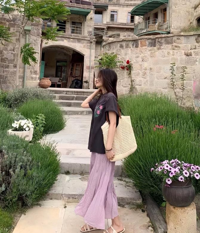 夏天的穿搭裏,又怎能沒有一條好看的裙子呢?紫色系的半身長裙,搭配印花t恤,這種萬能的搭配公式,不管是日常休閒,還是約會逛街都是妥妥的。有一種韓國小姐姐的既視感。