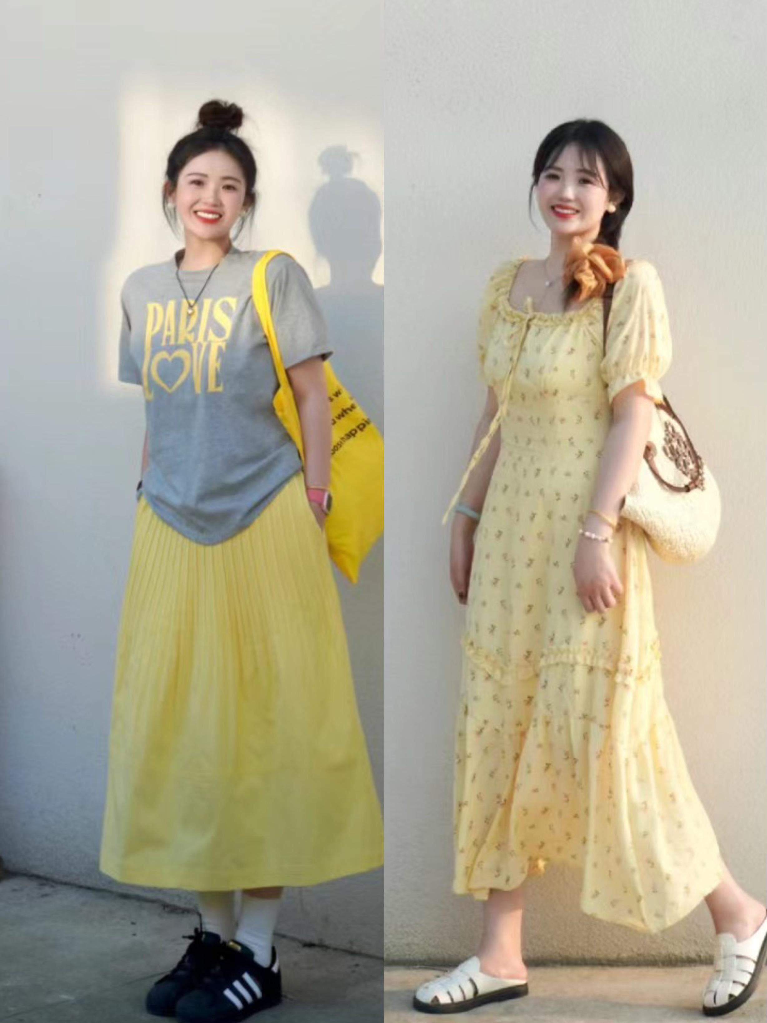 用不規則剪裁的T恤,搭配高腰的黃色半身裙,簡約又高級。黃色半身裙,可以與黃色包包、以及T恤的字母印花呼應,很亮眼、也很高級。