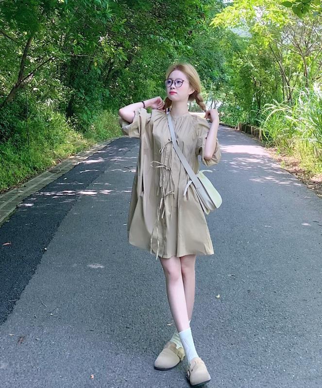 這一套有種日系girl的風格,寬鬆的小裙子,穿起來也太慵懶隨意了,亞麻材質,清涼舒適和透氣性都極佳的。膝蓋以上的長度,小個子女生也能輕鬆駕馭,隨便穿上一雙勃肯鞋,真的很舒適自在。