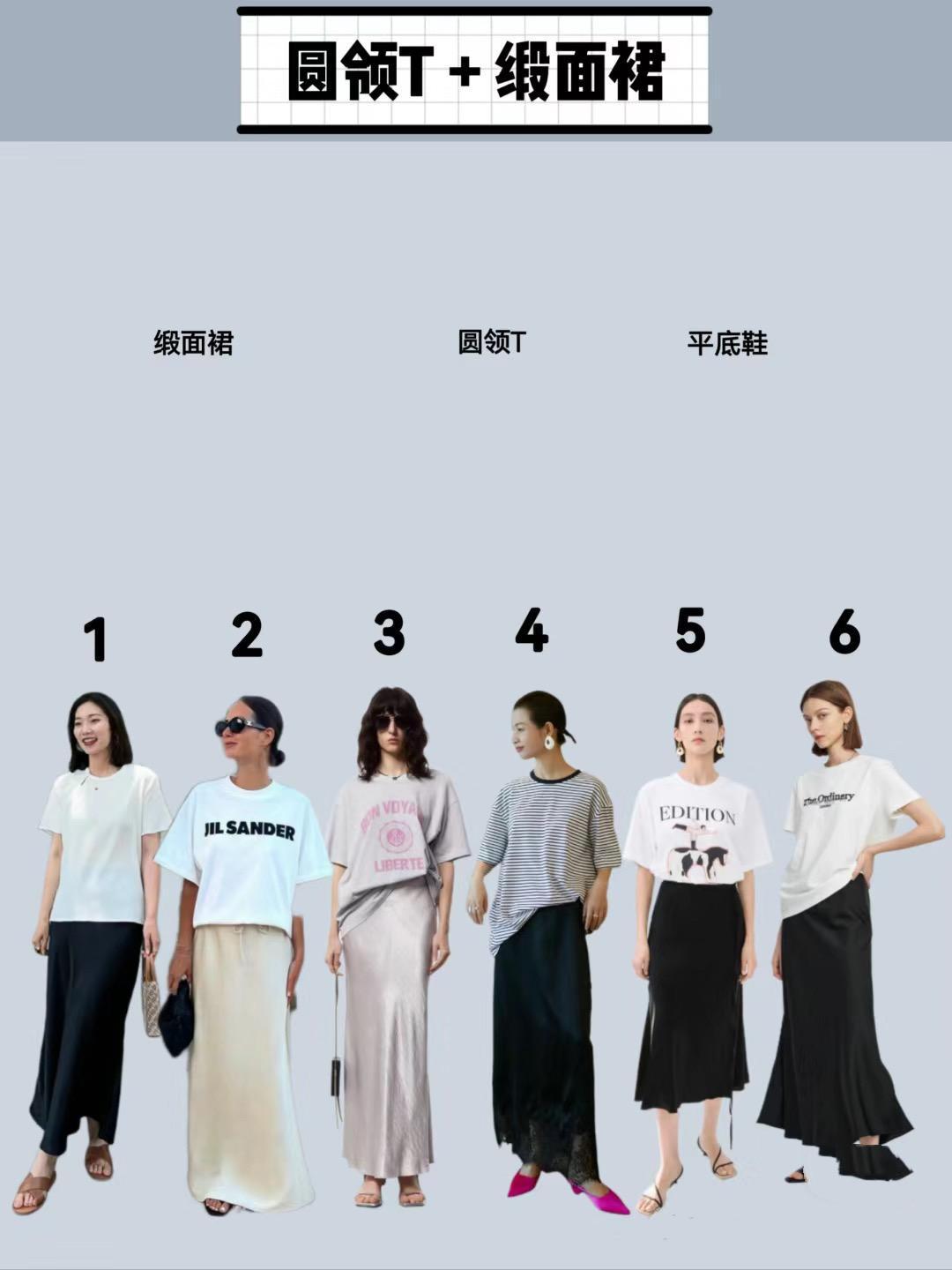 看似簡約基礎的圓領T恤,如何纔可以穿出優雅高級的女神範?只需要一條緞面半身裙,就可以拯救你平庸的造型。