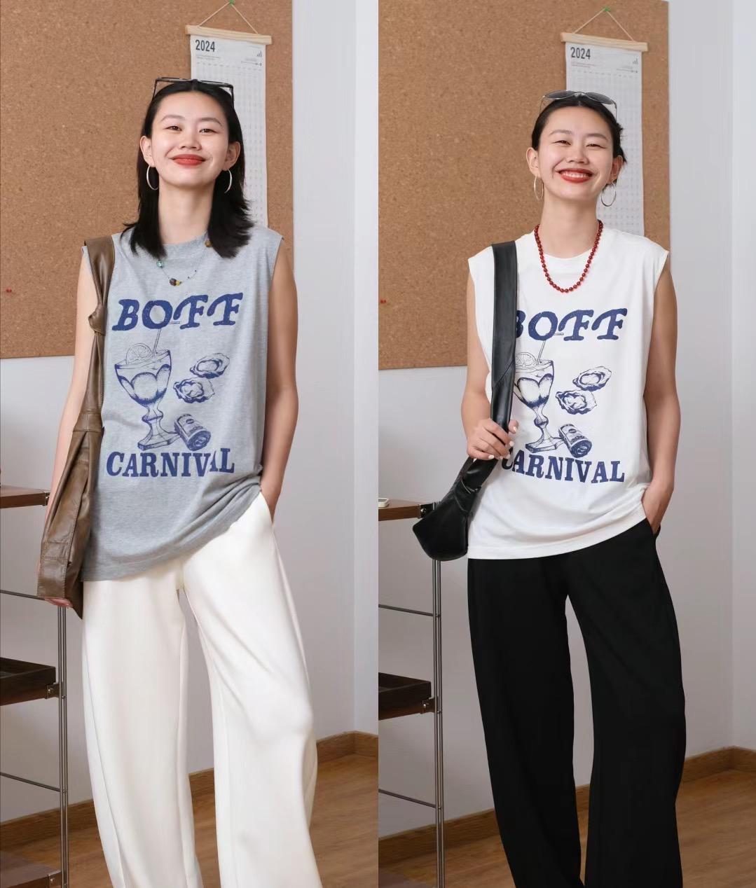 相對於小飛袖的圓領T恤,砍袖的設計會更加輕盈一點。如果不介意露手臂的話,夏天可以多穿着這種寬鬆的砍袖圓領T恤。