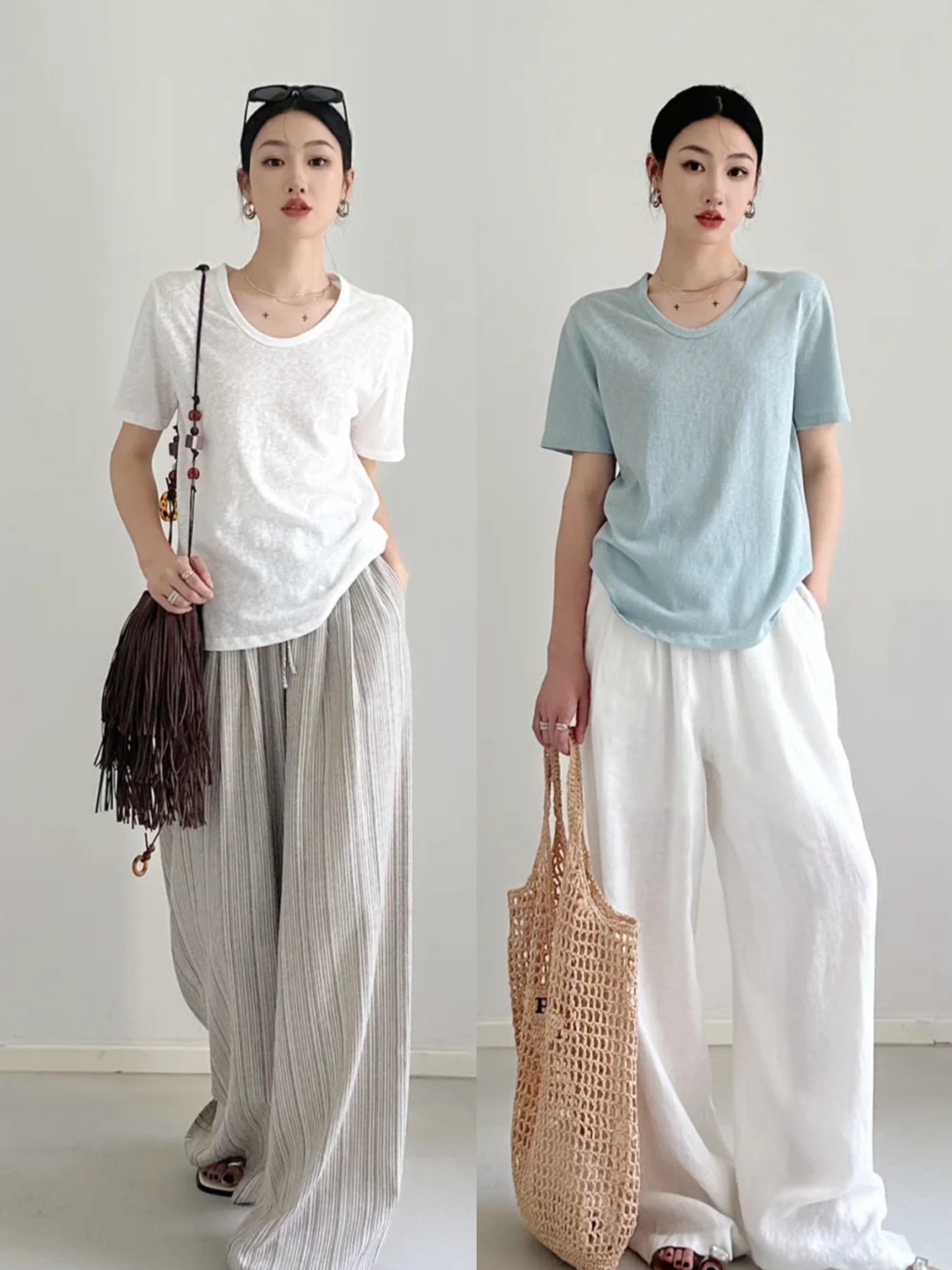 用輕薄的面膜T恤,來搭配帶有肌理感的山本褲,輕盈涼爽、遮肉顯瘦、還可以get大長腿。這種輕薄的淺色系面膜T恤,也太讓人喜歡了吧。