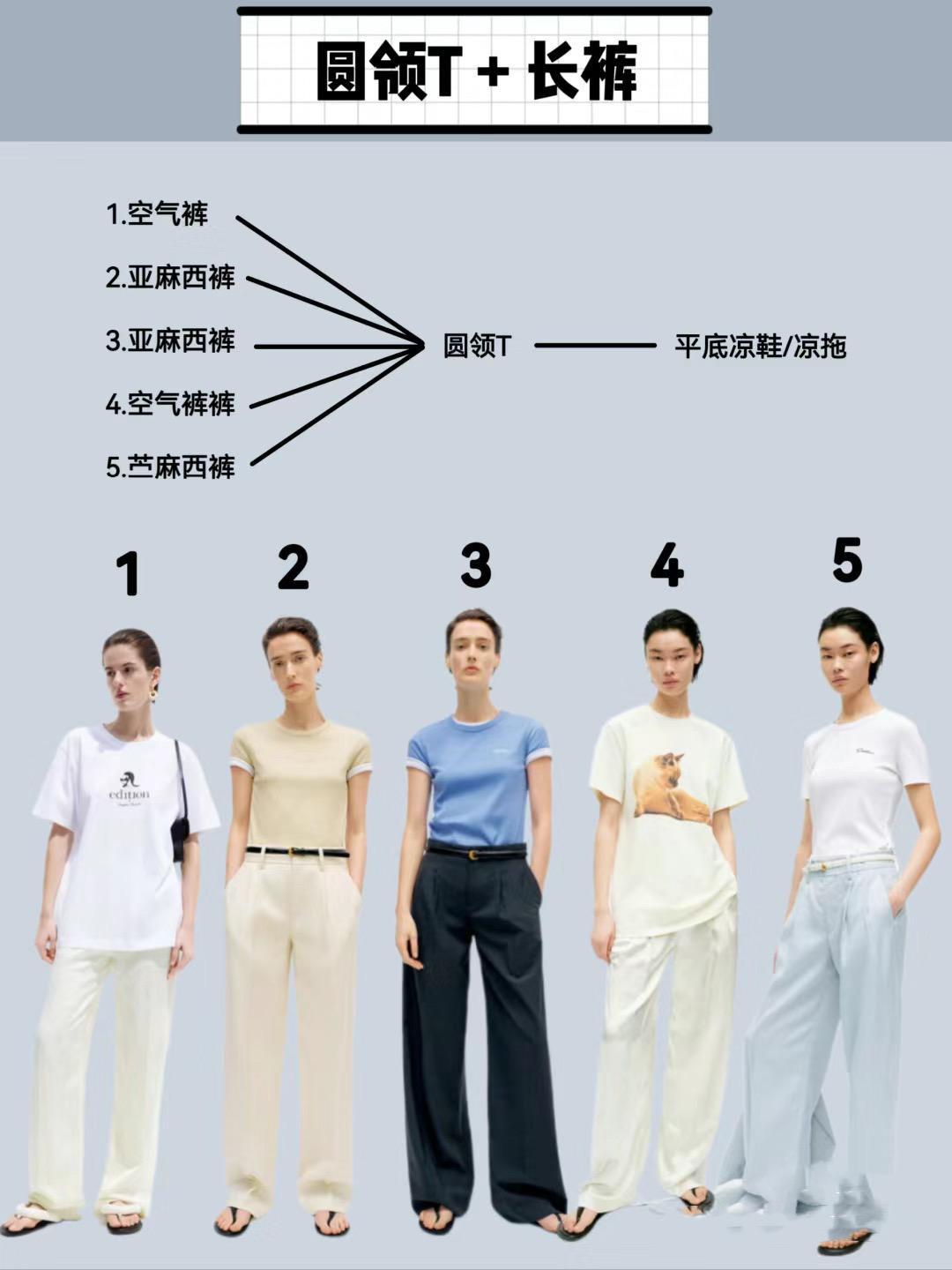 2、圓領T恤+長褲,基礎且大方,鬆弛中帶一點慵懶