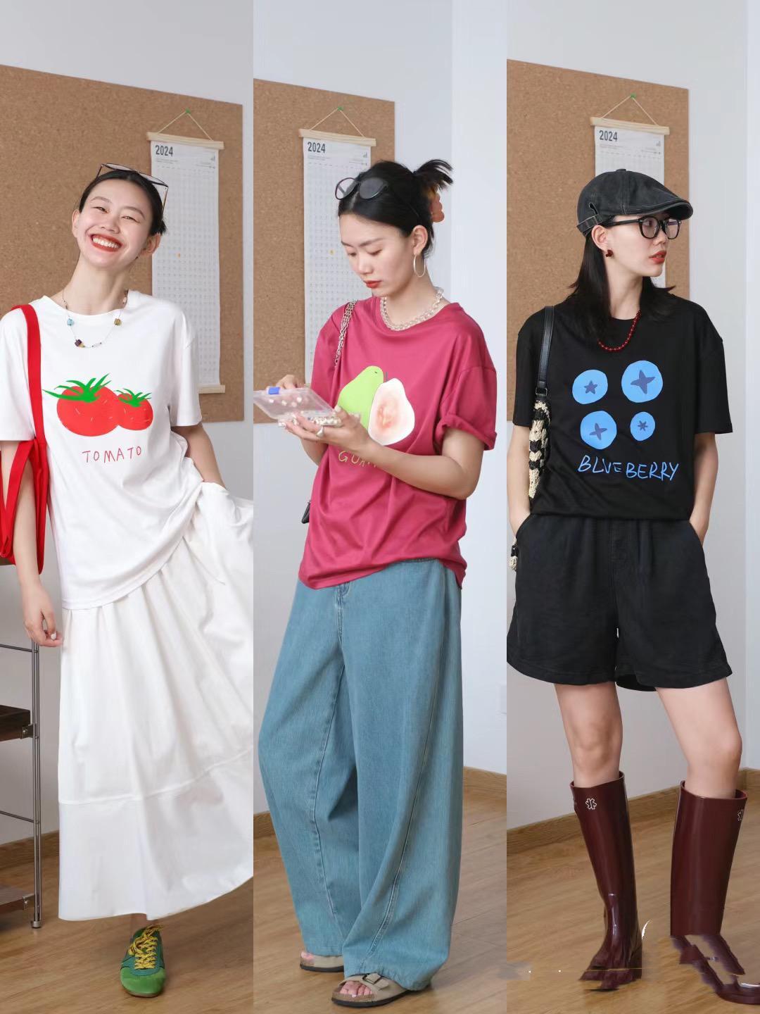 不管是寬鬆的、還是修身的圓領T恤,都可以配牛仔單品來穿着。比如直筒的牛仔褲、或者包臀的牛仔半身裙、修身的A字形牛仔半身裙等等,風格更多變。