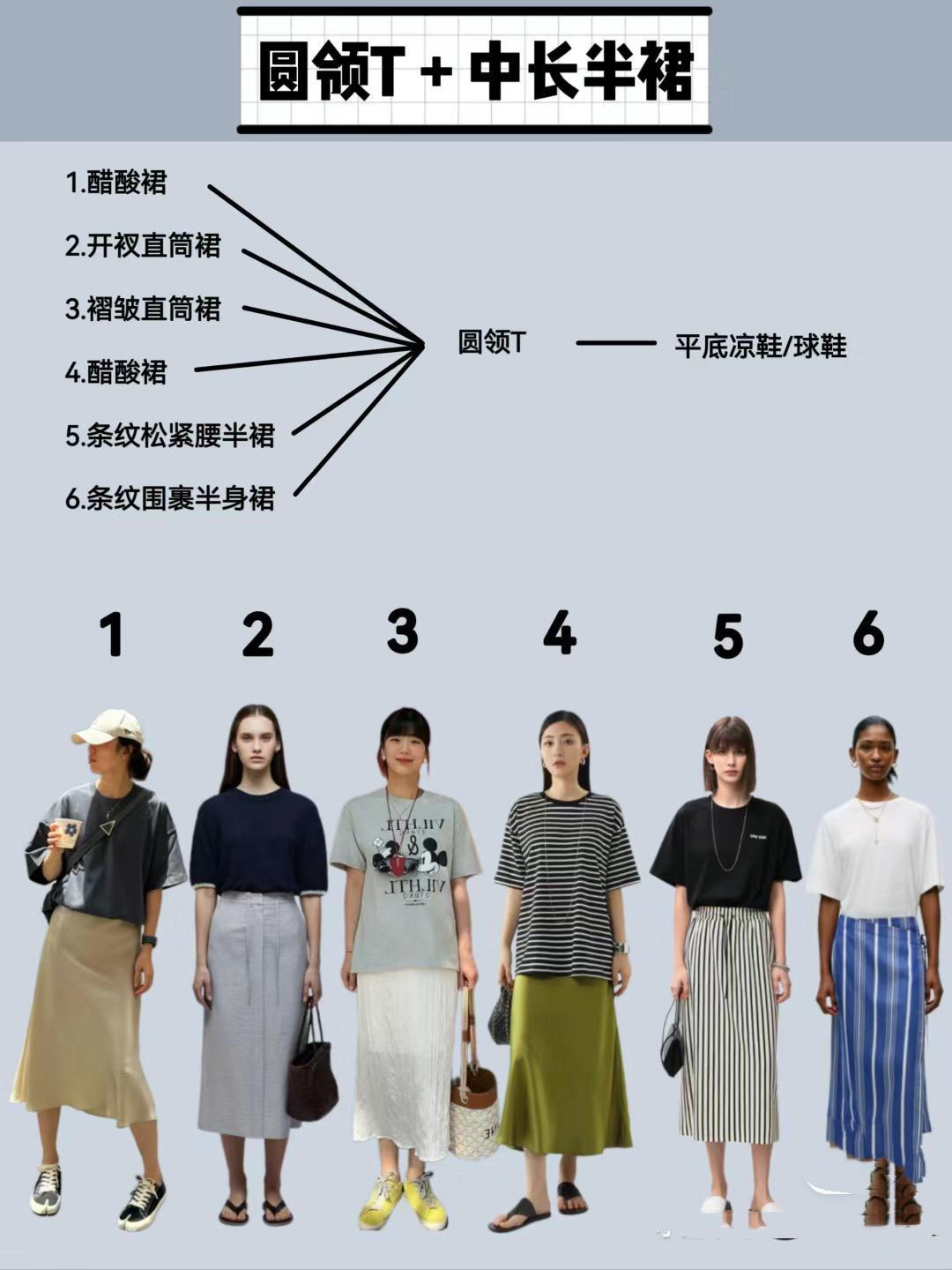 4、圓領T恤+中長款半身裙,可大方、可慵懶