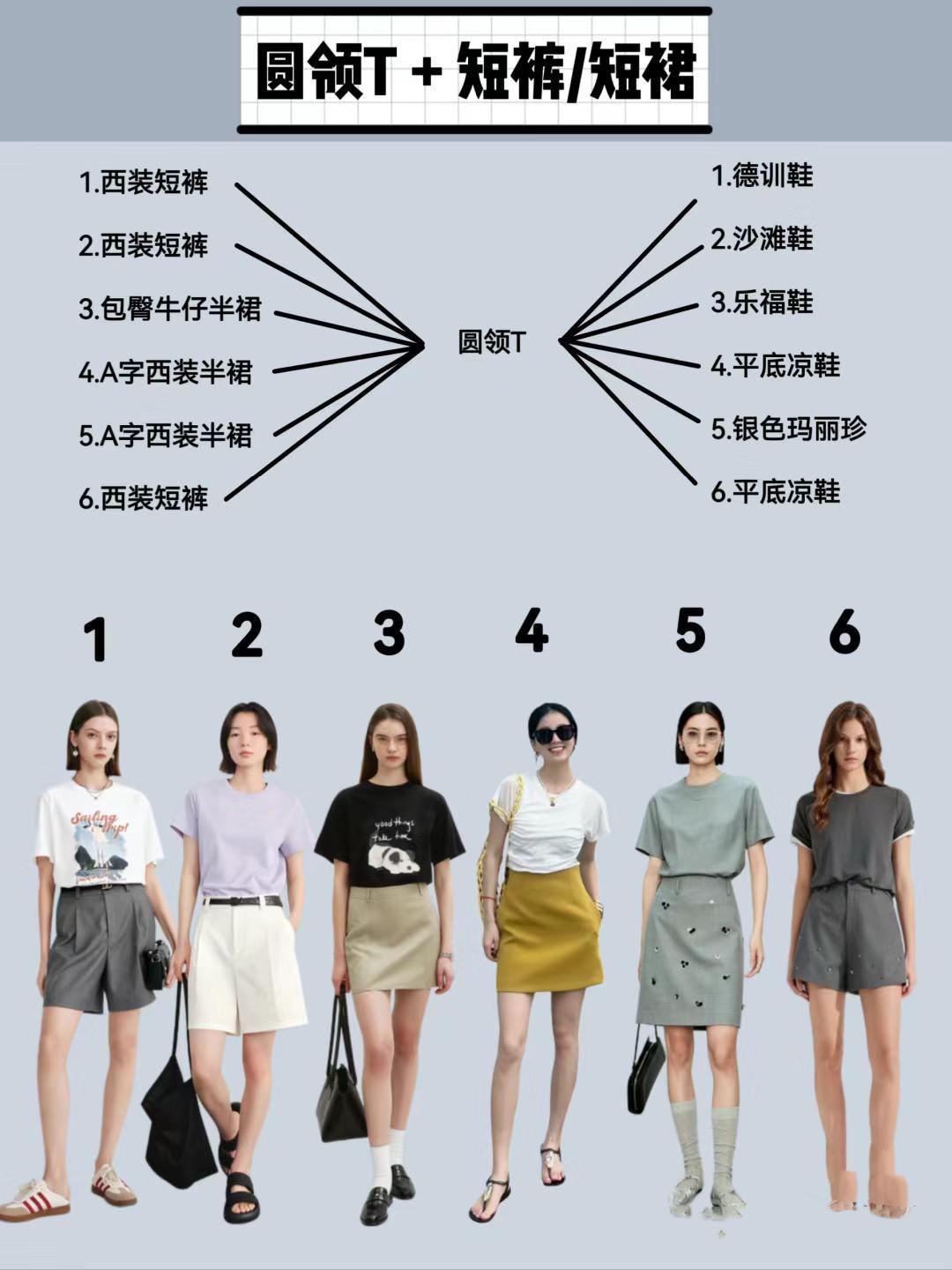 夏天裏的圓領T恤,真的是很百搭。配不同風格的下裝、也可以更自然的切換不同風格。比如西裝短褲、A字形半身裙、包臀裙都可以嘗試。