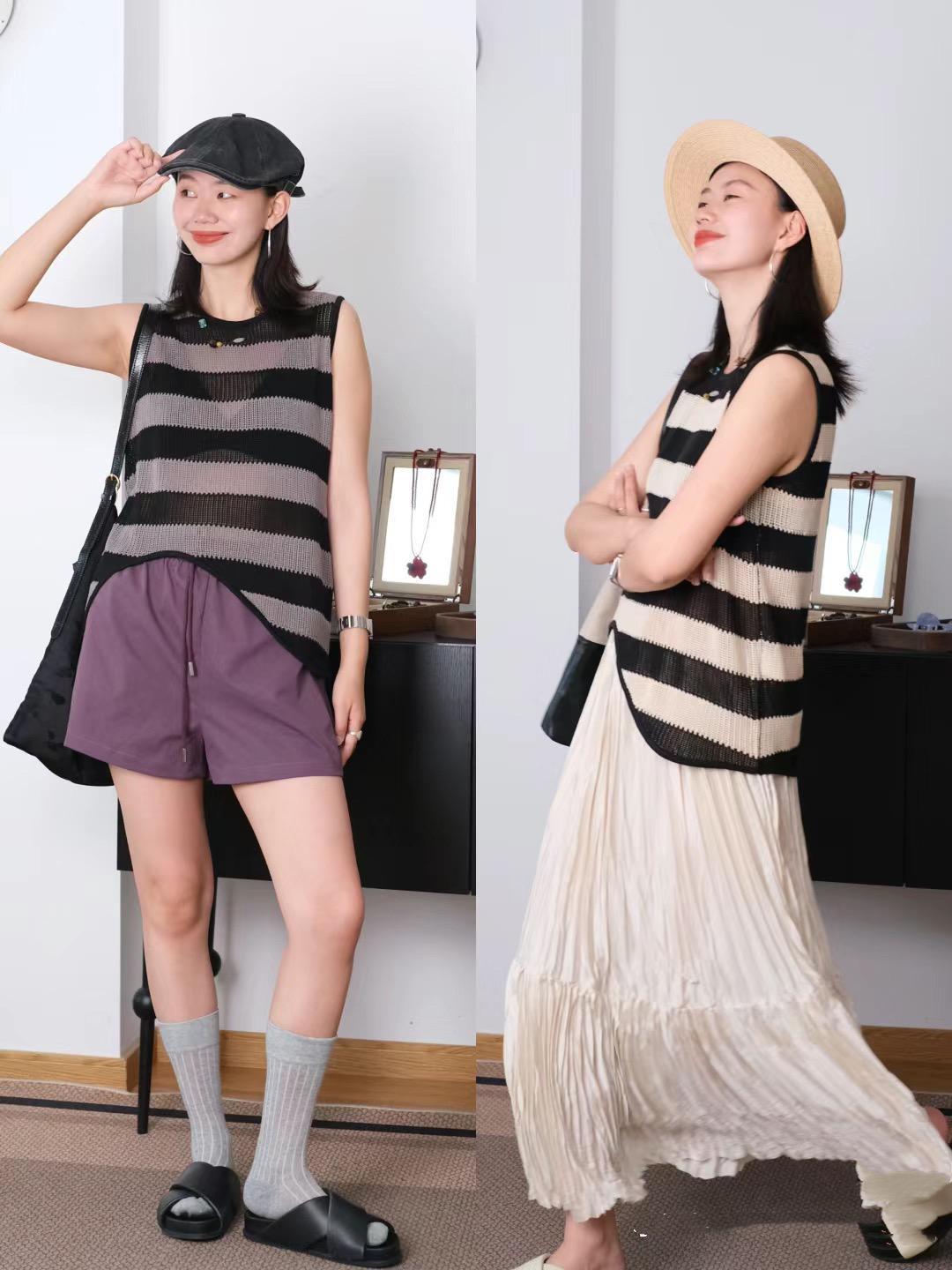 經典又時尚的條紋背心,穿起來會有一種格外醒目的美。相對於純色系的低調,條紋背心必然更加醒目洋氣一點。