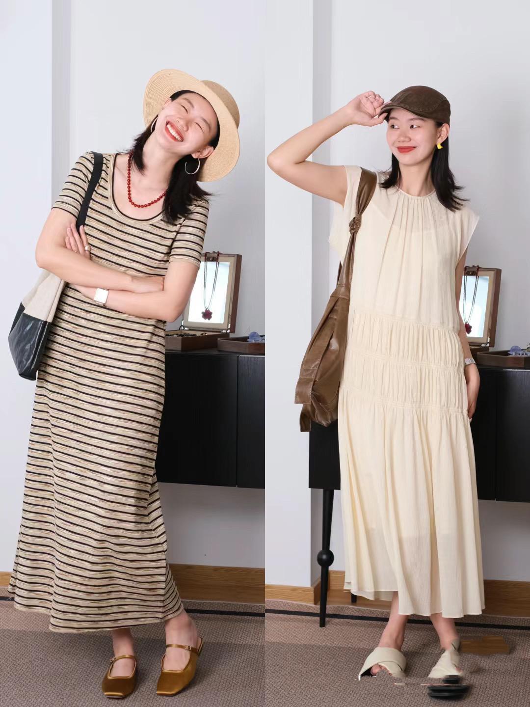 度假風穿搭,配飾的點綴很關鍵。穿着可以寬鬆慵懶,但配飾一定要起到點睛之筆。尤其是這種條紋連衣裙、或者杏色連衣裙,基礎款式更需要配飾加分。