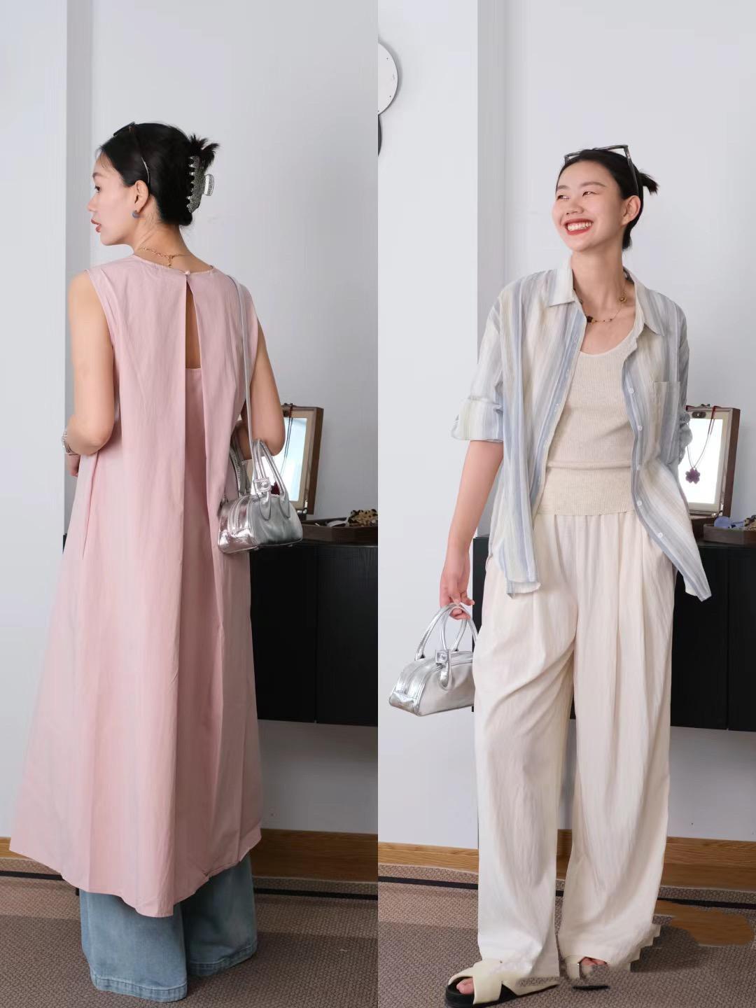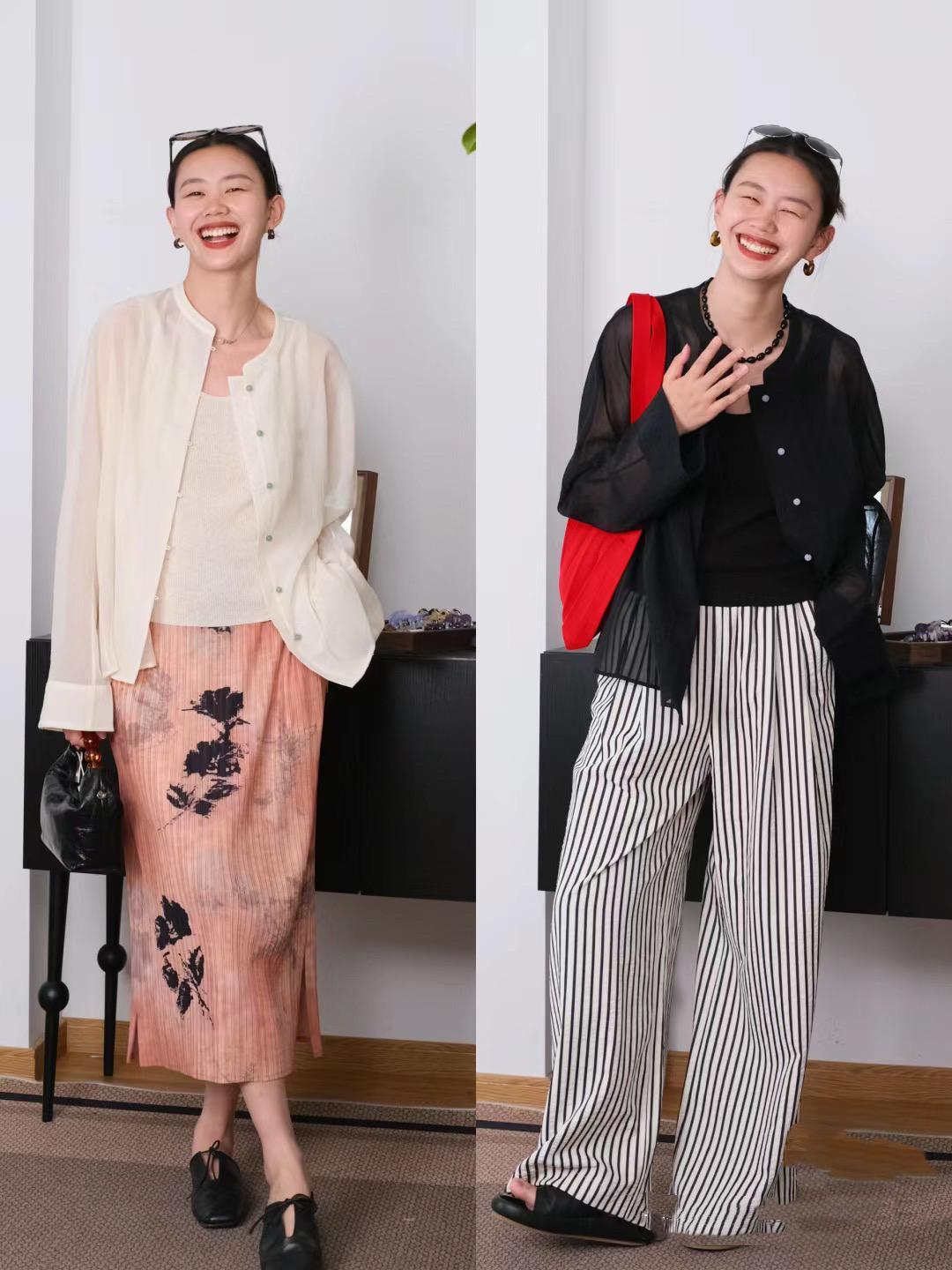 寬鬆的襯衫、一定要選擇有腔調感的設計。比如小豎領的國風襯衫、相對寬鬆一點的版型,上身就很舒適,體面中帶着屬於自己的腔調感。