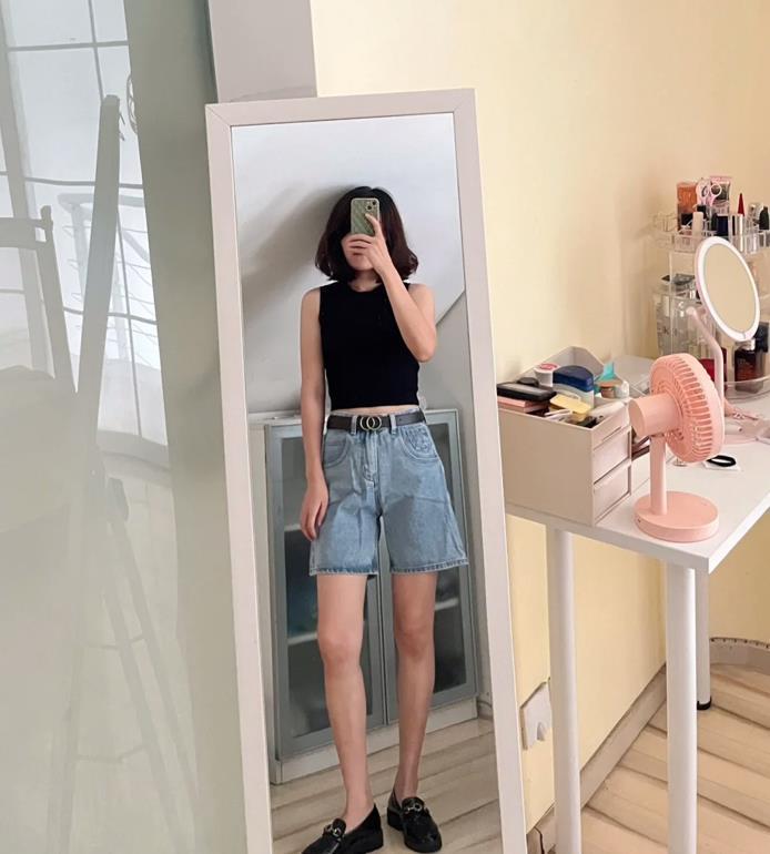 牛仔五分褲,今年夏天也可以穿起來了,比起過短的長度,這個更適合大腿粗的身材們,選擇寬鬆些的版型,才能給你帶來舒適自在感,當然,更重要的還是顯瘦。上衣配一件黑色無袖衫,清爽涼快又帶着幾分酷帥氣息。