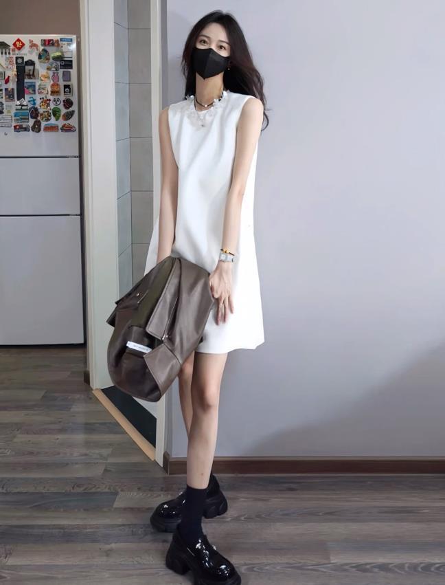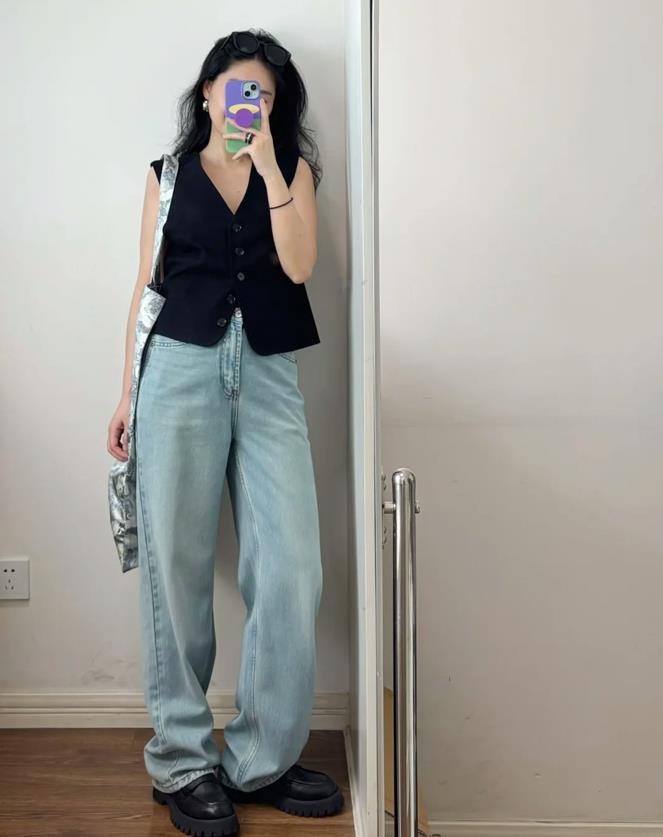 西裝馬甲也可以單穿?比起疊穿,夏日似乎更流行這種穿法,清爽涼快又很顯瘦,v領的設計,可以很好拉長脖子線條,搭配水洗牛仔闊腿褲,再加上一雙黑色厚底樂福鞋,簡單又很有範。