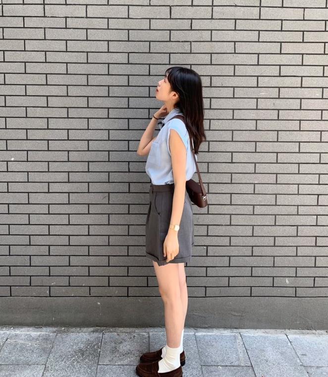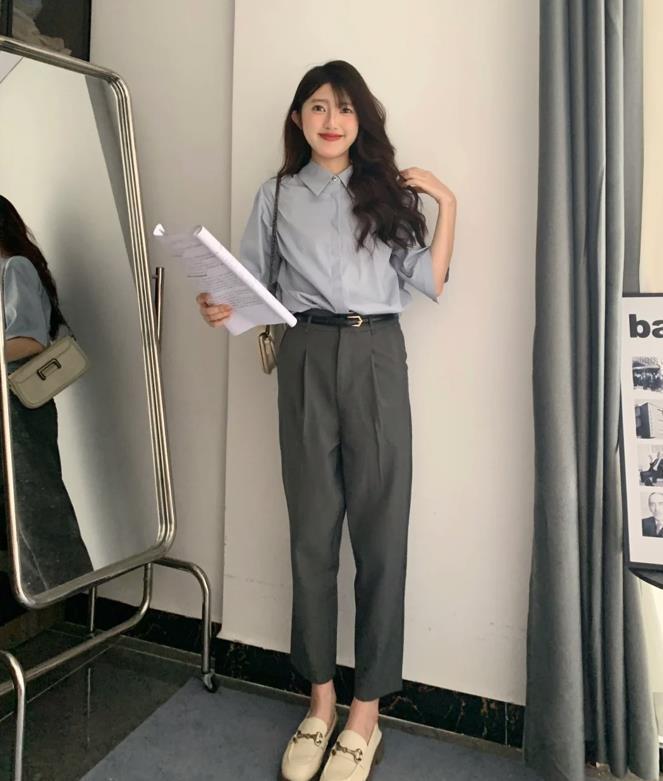 不露腿的夏日穿搭,對於腿型比例不是那麼好的姐妹,就可以這樣穿,淺藍色襯衫+灰色西裝褲,九分的長度,很好增加了利落感,這麼經典氣質的穿搭,上班的姐妹可以借鑑起來,鞋子選的是一雙樂福鞋,可舒適自在了。