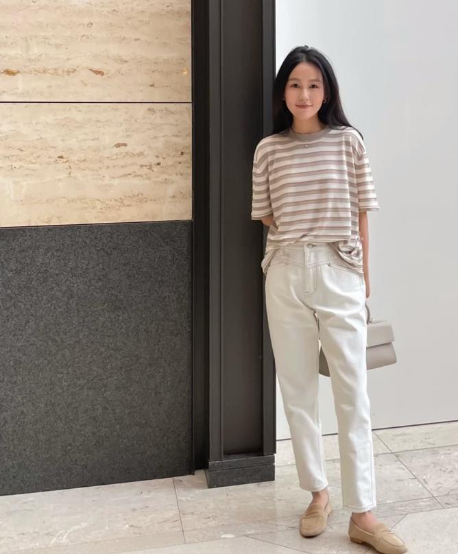 40+不費力的一套舒適通勤穿搭,當然,也適合日常逛街穿,當你不知道穿啥的時候,就選擇一條牛仔褲配t恤吧,簡單卻又不失時尚,搭配一雙樂福鞋,有種很自信從容的態度。