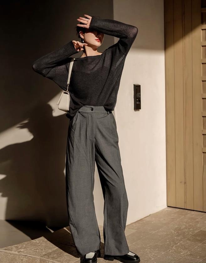 灰色就是一種很簡約百搭的色調,這麼一條灰色西裝闊腿褲,隨性、慵懶又不失簡約範,與黑色鏤空防曬罩衫搭配,毫不費力就拿捏了鬆弛感,再搭配一雙黑白拼色的樂福鞋,時髦又好看。