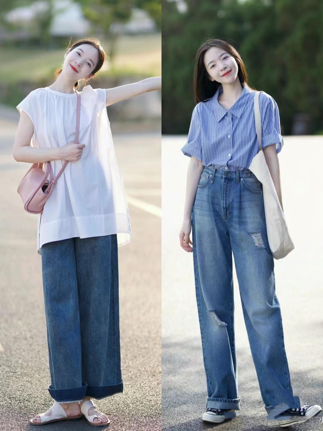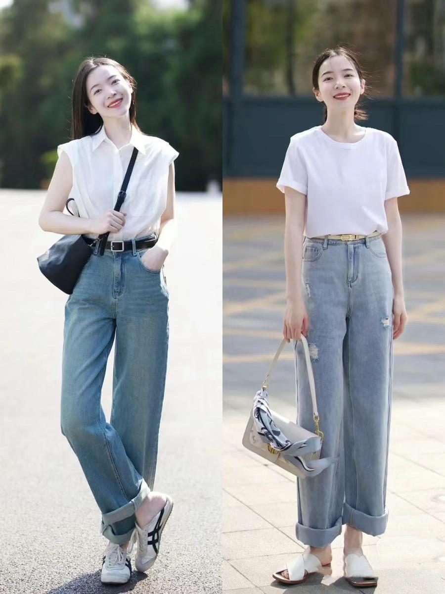 像這種白色的襯衫、或者T恤,都可以配藍色的牛仔褲來穿着。藍色牛仔褲搭配卷褲筒的穿法,營造出一種九分褲的效果,也是更加輕盈時尚。